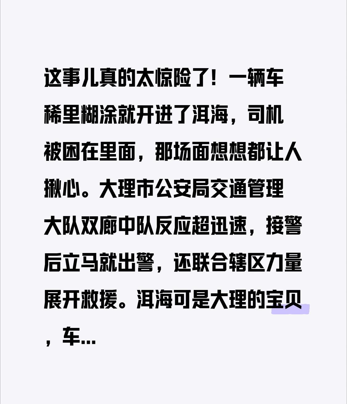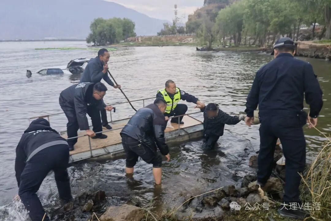 [震惊][震惊][震惊]惊险!一车辆不慎开进洱海,司机被困,民警紧急救援→这事儿真的太惊险了!
