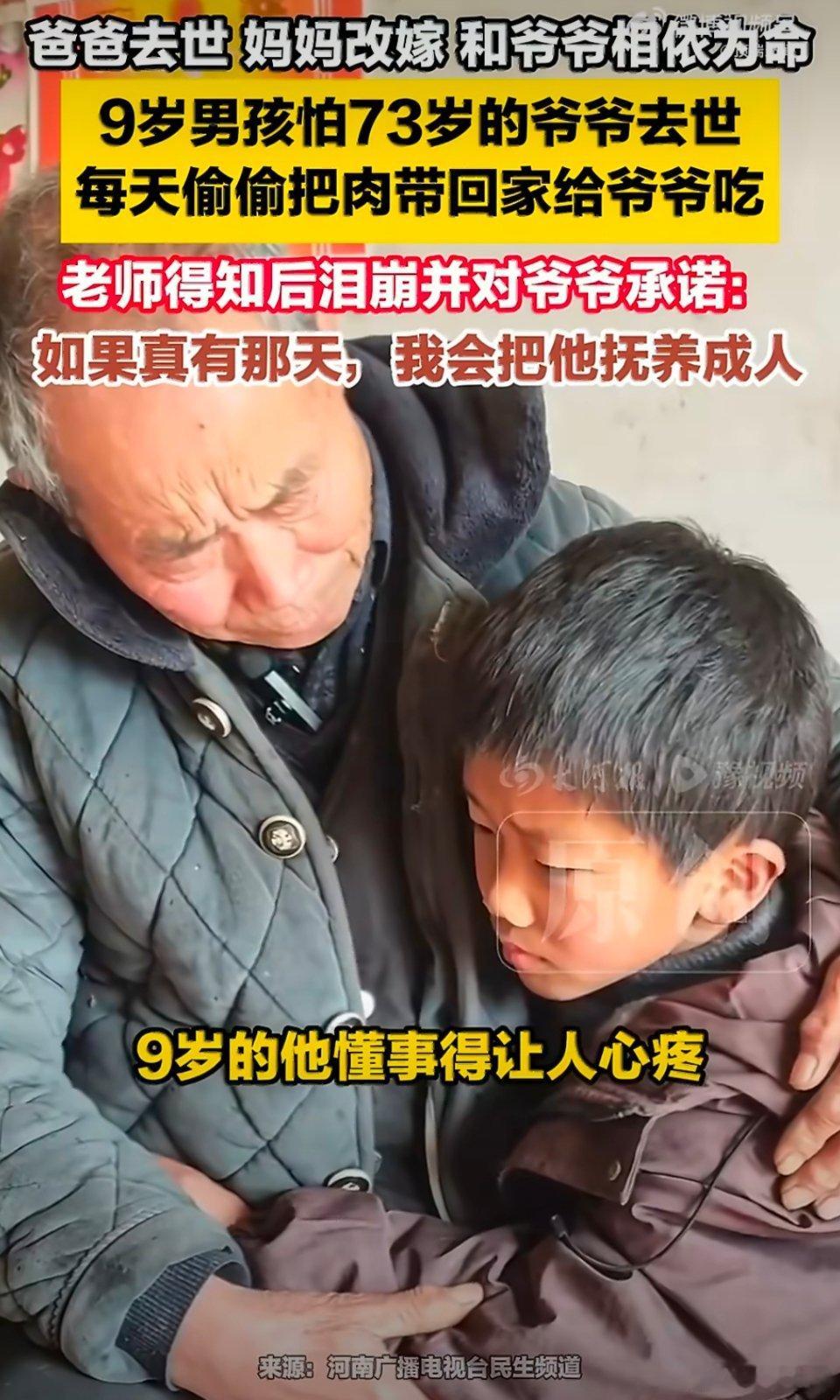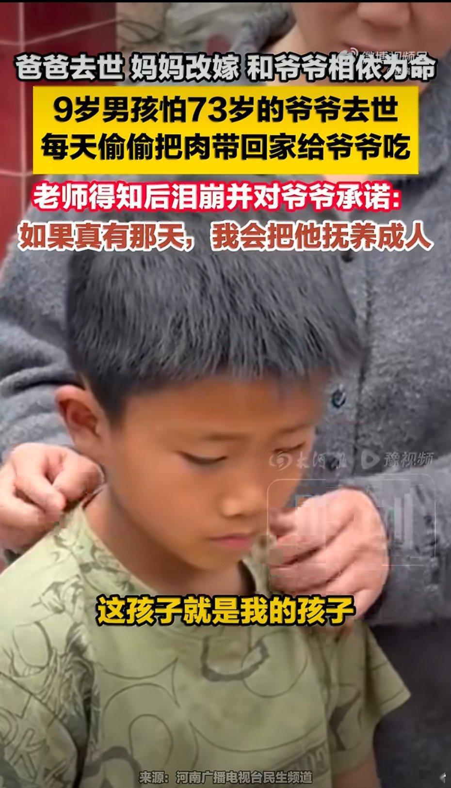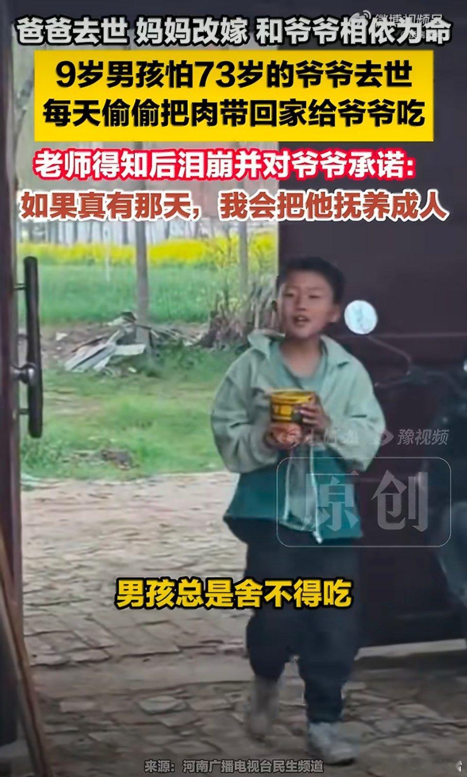 还好有老师的承诺、村委的帮扶,愿祖孙俩往后岁岁平安🙏 孙子怕爷爷去世每天偷偷带肉回家回答:9岁男孩偷偷给爷爷带肉当地已介入