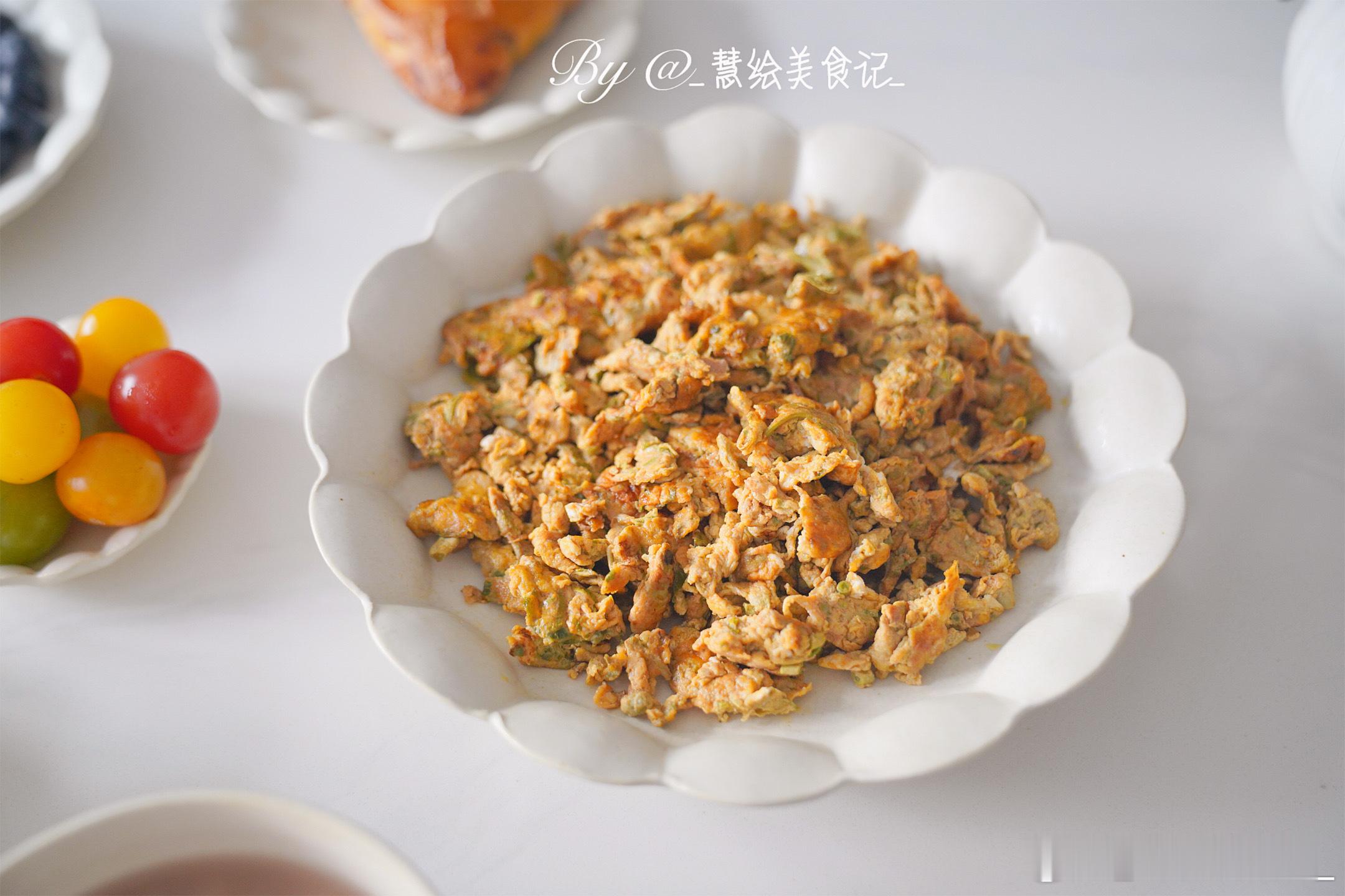 新周愉快早餐香椿炒鸡蛋、醋溜土豆丝、绿豆粥、蔓越莓司康、拿铁咖啡、小番茄、蓝莓~我的美食日记