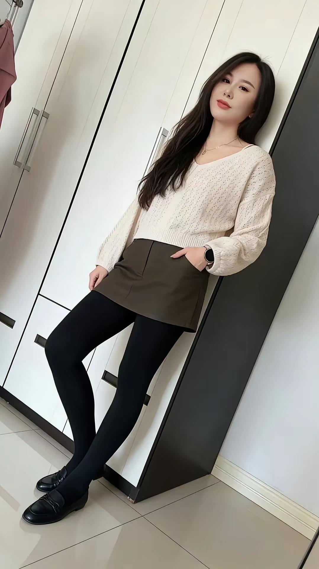 简约优雅穿搭,米色毛衣+黑色短裙,轻松舒适