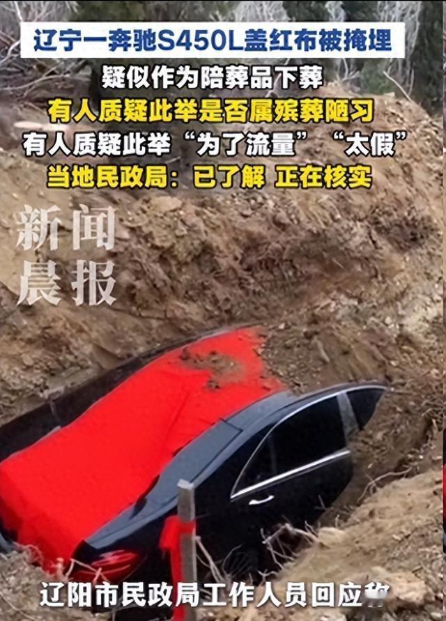 辽宁辽阳的一处荒山上,一台身价过百万的奔驰S450L被挖掘机缓缓吊起,直接放入了深坑。