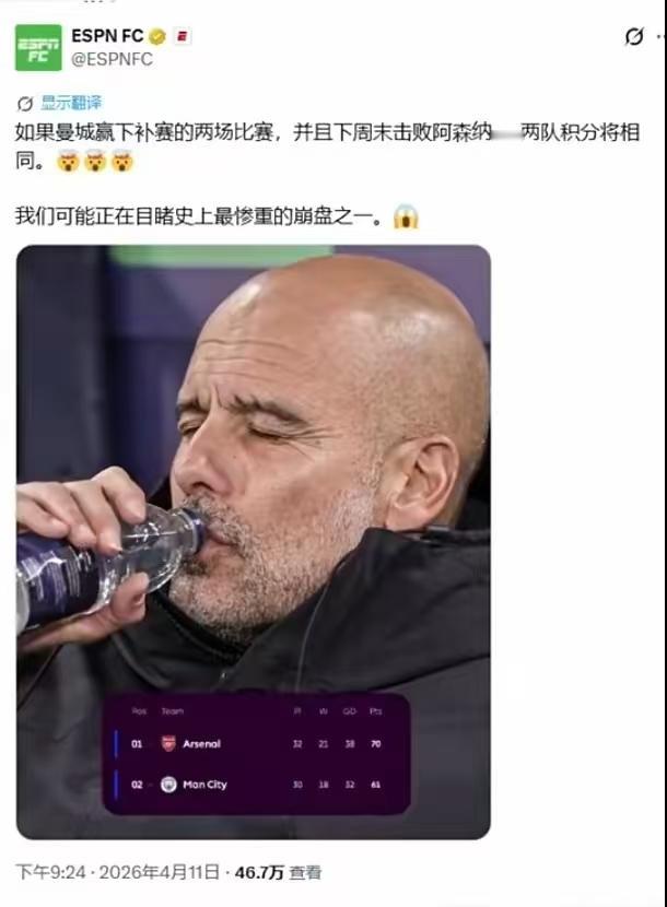 曼城3:0斩杀切尔西,阿森纳被“喝水”给误伤了。