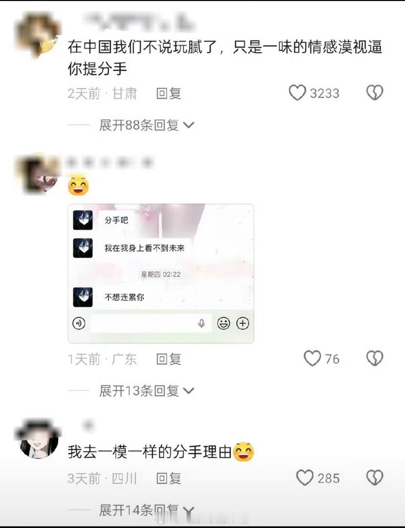 在中国我们不说玩腻了分手吧真是一生含蓄的中国人在中国我们不说玩腻了我们分手吧,我们说宝贝,我认真想了很久,我们好像真的不合适。我给不了你想要的陪伴,也跟不上你期待的未来,继续下去对你太不公平。我不想拖着你消耗你,更不想让你在我身上浪费更多真心。你值得被人坚定选择、时刻惦记,而不是像现在这样患得患失。放过彼此,才是对你最好的成全,往后各自安好,就别再回头了。