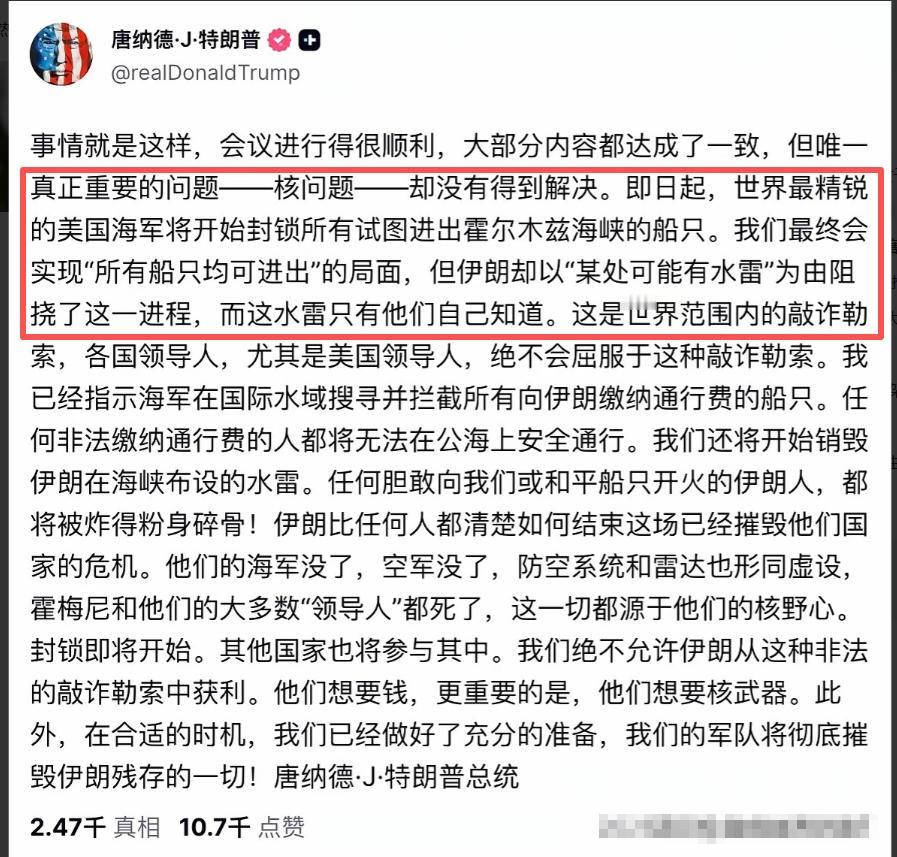封锁海峡这个命令,很大程度上是说给美国自己人听的,意思就是“你们看,我对伊朗可一点不软”。但国际政治不是发条帖子那么简单,尤其是动刀动枪的事。