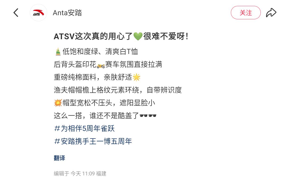安踏签约王一博为全球首席代言人五年了,因王一博带来的创意灵感从滑板系列到赛车系列,还有户外装 ,还有竹叶青。[赞]