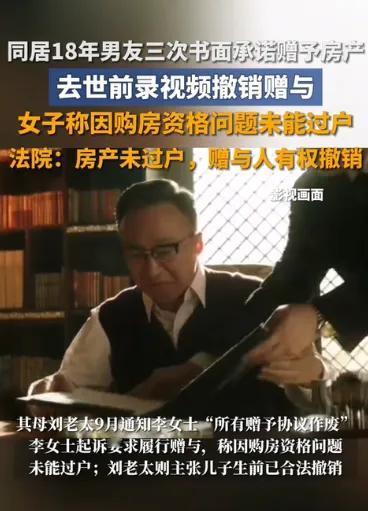 北京,一女子被男友忽悠,说先同居试婚再结婚,承诺把价值几百万的房子给女子,还3次写了赠予协议,可2人同居18年,这婚也没结成,男子病入膏肓后,竟然瞒着女子,在离世前1个月,录视频撤销赠予,男子死后,他母亲拿着视频,说“所有赠予协议作废”,让女子赶紧搬走,女子愤怒的把男子母亲告上法庭,法院的判决让她欲哭无泪:我太冤了,被白嫖了18年!