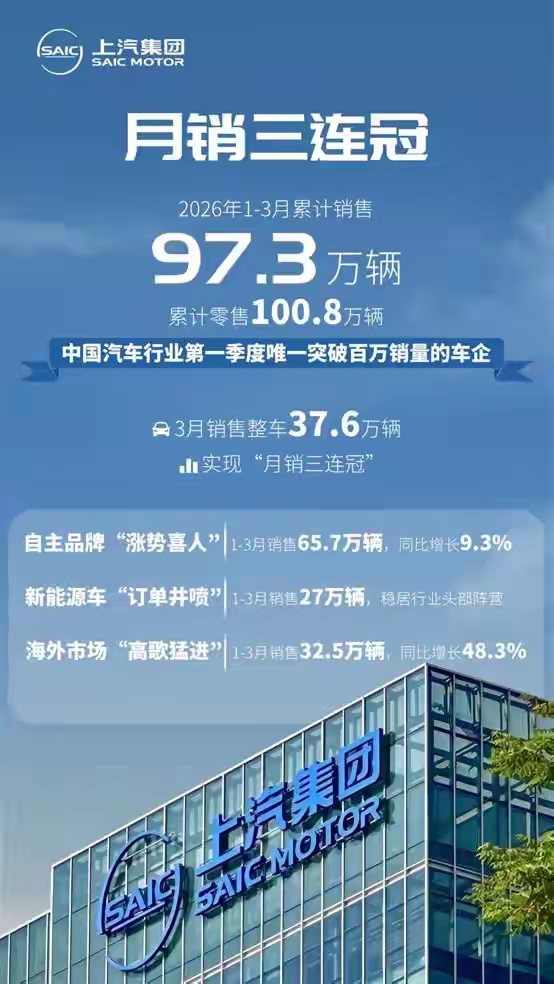 上汽集团:累计销量32.5万辆,同比增长48.3%;
