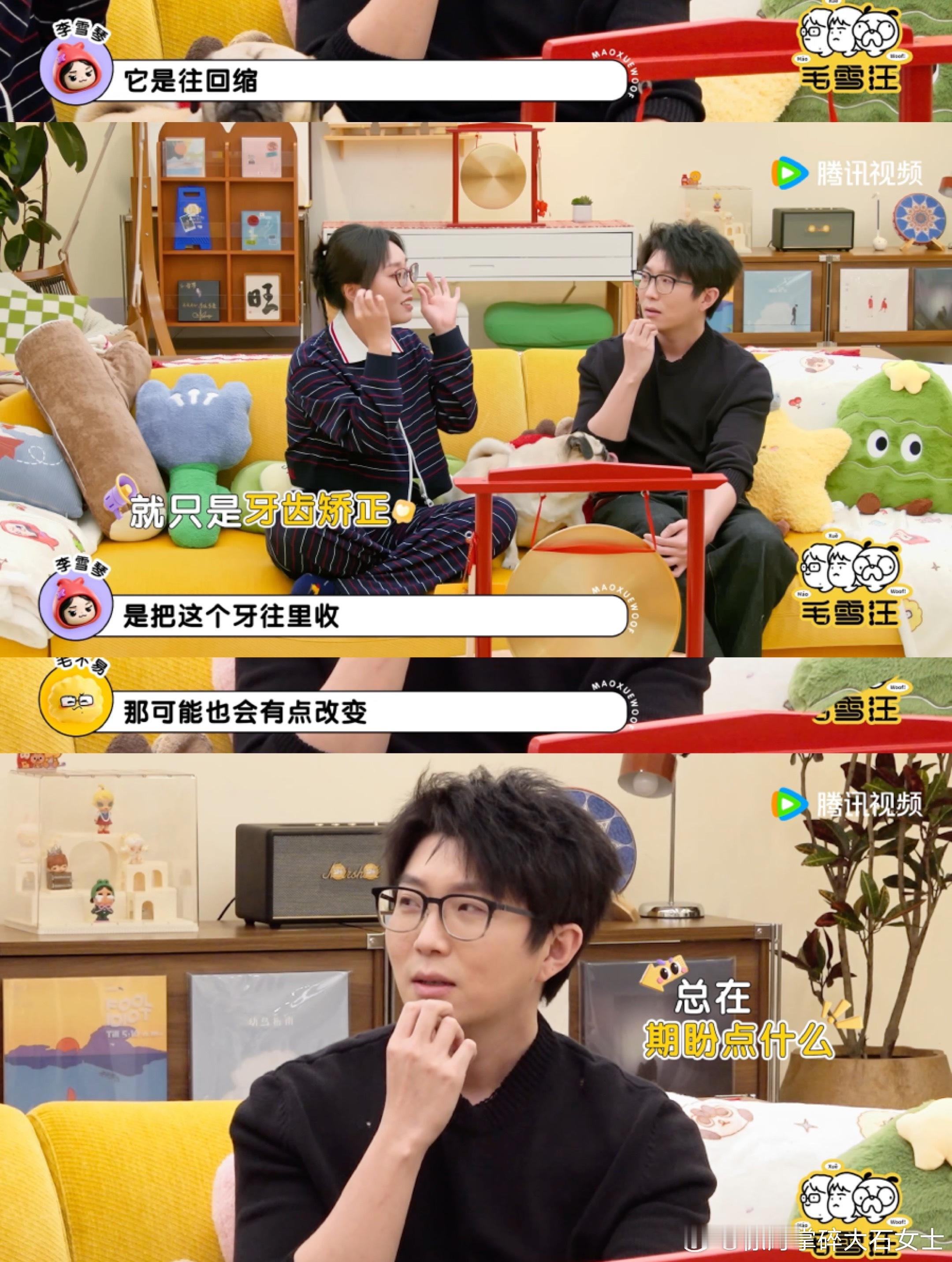毛不易知道李雪琴整牙后的反应 毛不易对整牙的迷信程度,堪比某些人对转发锦鲤。李雪琴只是提了一嘴,他立刻接话:那你整完牙得多好看!然后开始畅想颜值飞升。李雪琴本人可能都没想那么远,毛不易已经帮她规划好了变美蓝图。