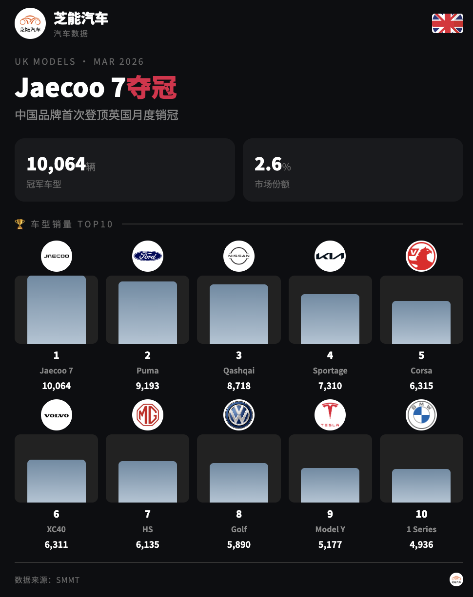 奇瑞集团(含 Chery、Jaecoo、Omoda)总和销量 22,495 辆,以集团口径位列全品牌第二,成为中国品牌在英最强势力。