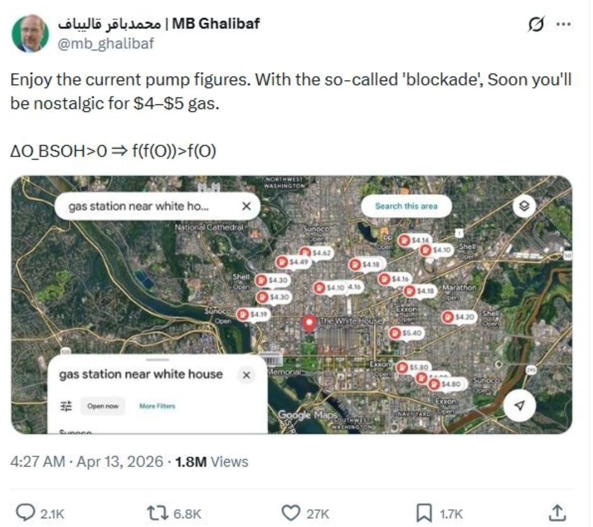 伊朗议长在社媒发文,贴出了一张白宫附近加油站汽油价格的图。
