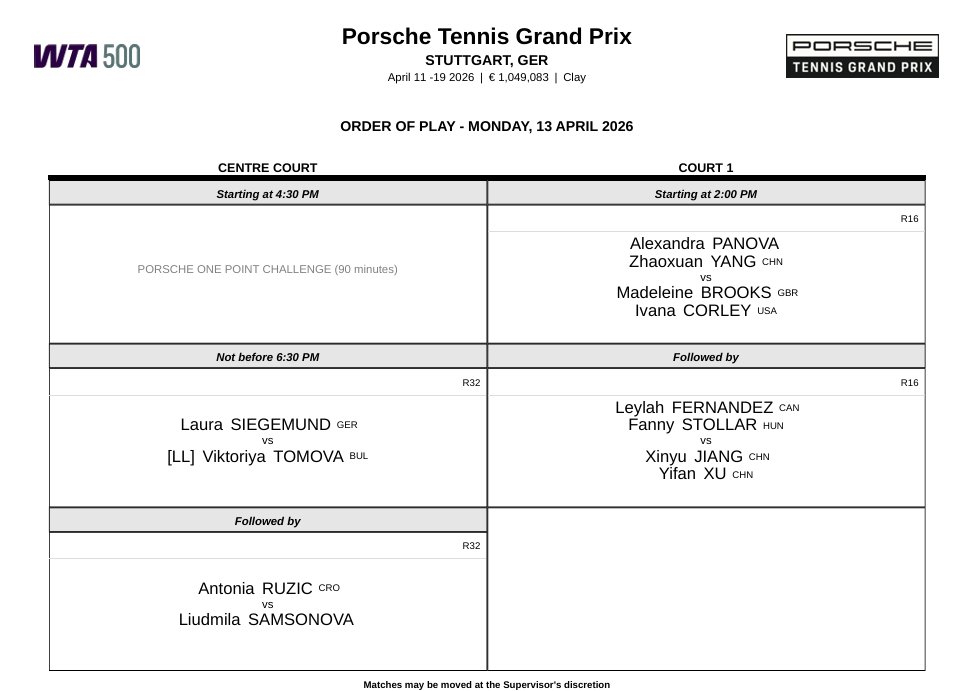 西格蒙德、萨姆索诺娃亮相,杨钊煊/帕诺娃、蒋欣玗/徐一璠出战双打。中心场不早于北京时间凌晨0:30开赛,1号场20:00。