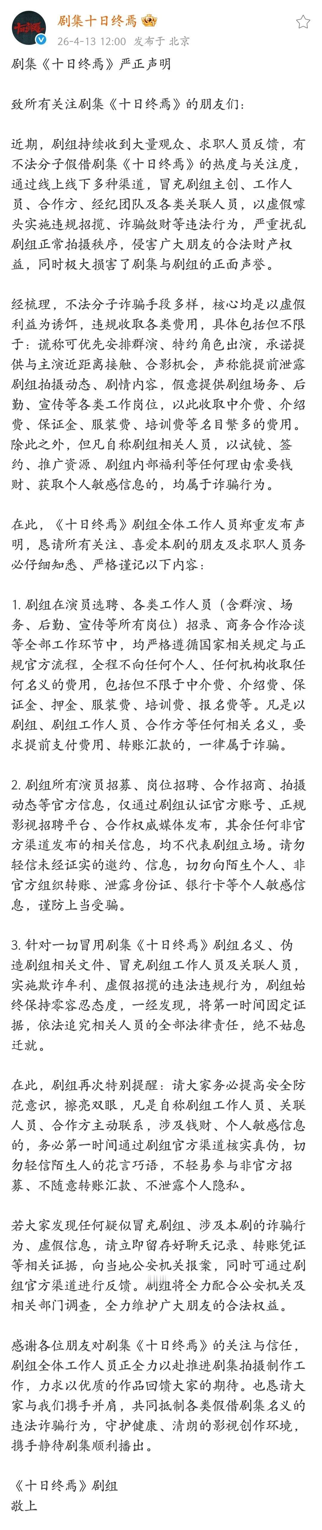 十日终焉剧组发声明了,警惕冒充剧组人员发布虚假信息的骗局避免影响自身及剧组!祝剧