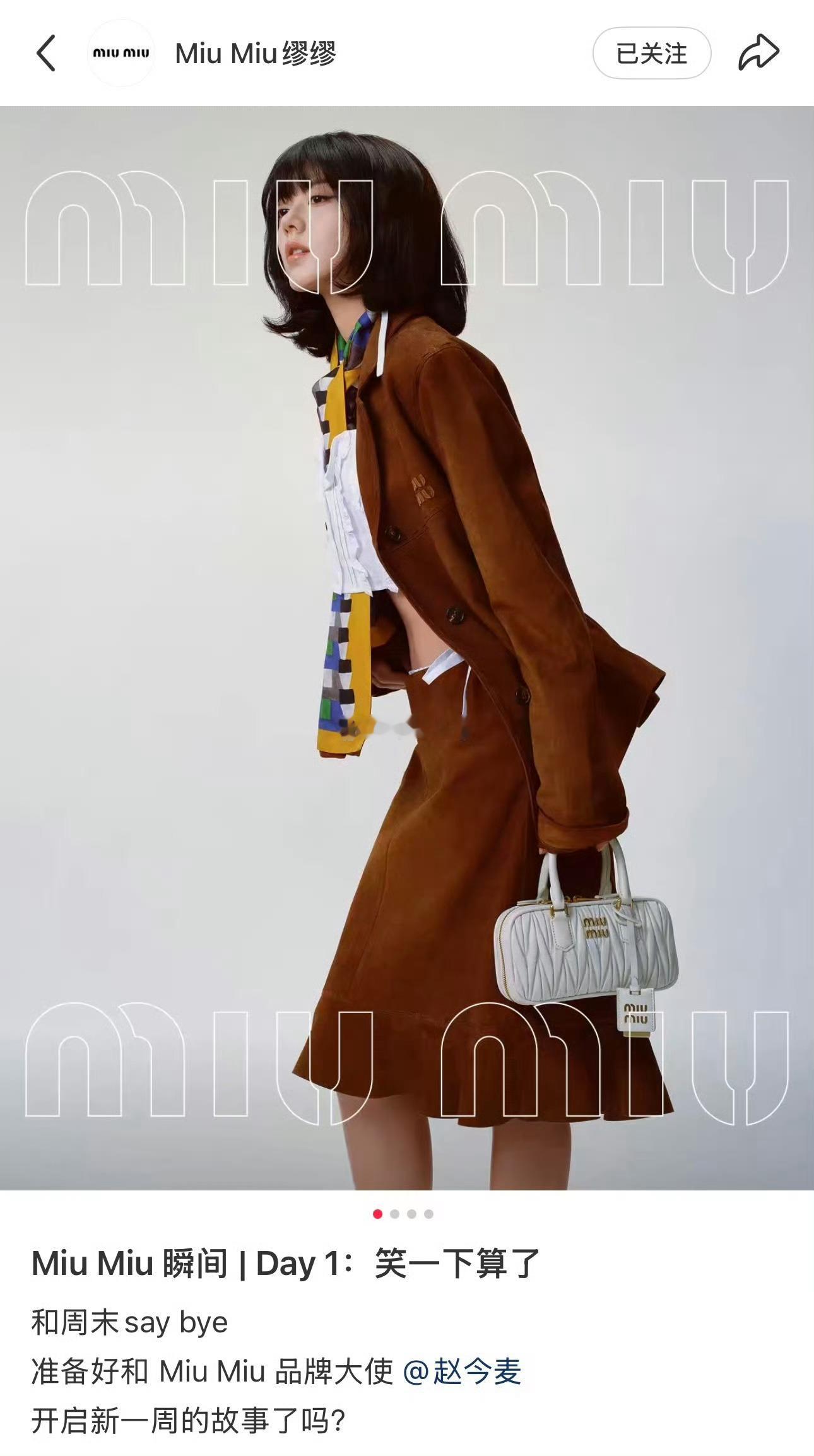 miumiu就这样力挺赵今麦miumiu品牌大使赵今麦出镜MiuMiu最新宣传大片,摩登女孩 文案“笑一下算了”