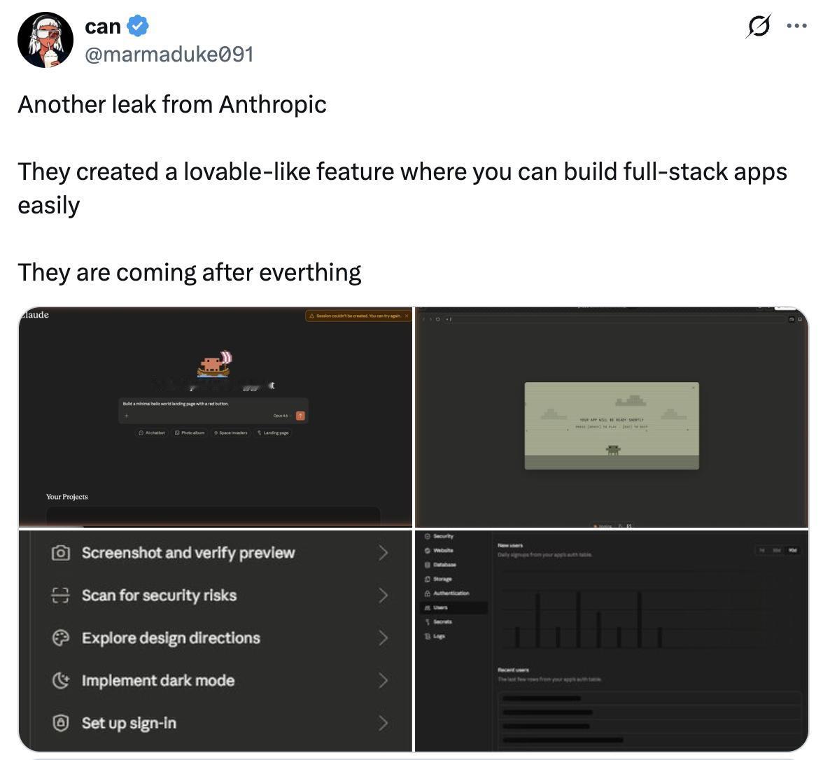 最近有消息泄露说 Anthropic 正在开发一款自动开发前后端软件的功能,和国外很有名的那个 Lovable 很像。但是感觉 Lovable 更偏向于前端,后端功能很弱。Anthropic 这个肯定是前后端一起生成了,但是一句话,一个 PRD 或者一个 SPEC 文档就能生存整个应用了,而且还是带源码的应用。