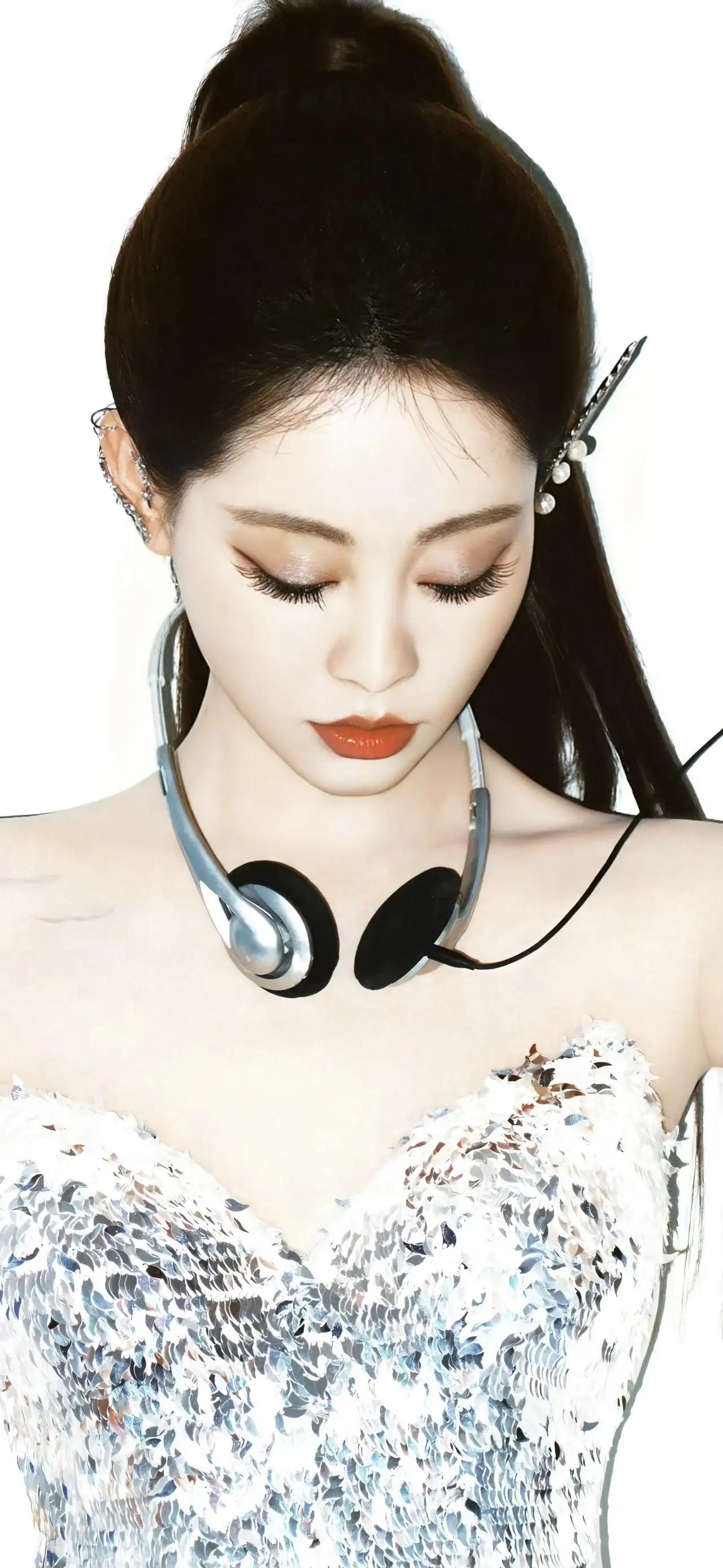 美女壁纸~祝绪丹,银白亮片鱼尾裙勾勒出曼妙曲线,高马尾飒爽飞扬,黑绳缠绕间尽显冲