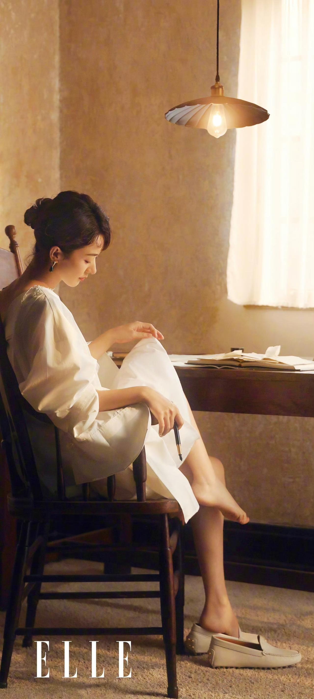暖调光影里,一袭宽松白裙慵懒随性,低盘发搭配松弛姿态,伏案书写的模样像从旧时光里走出的文艺女作家,温柔又有力量。