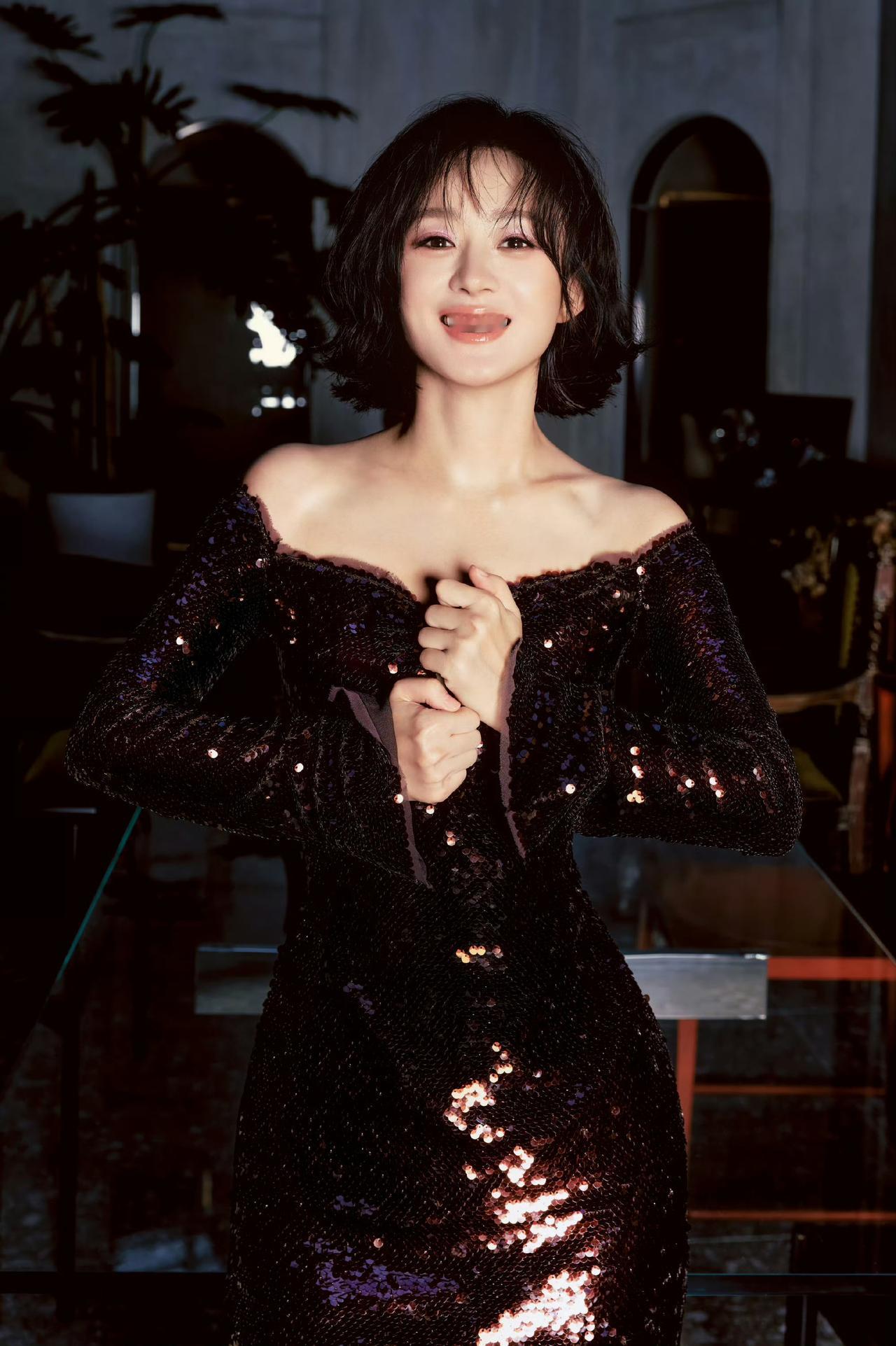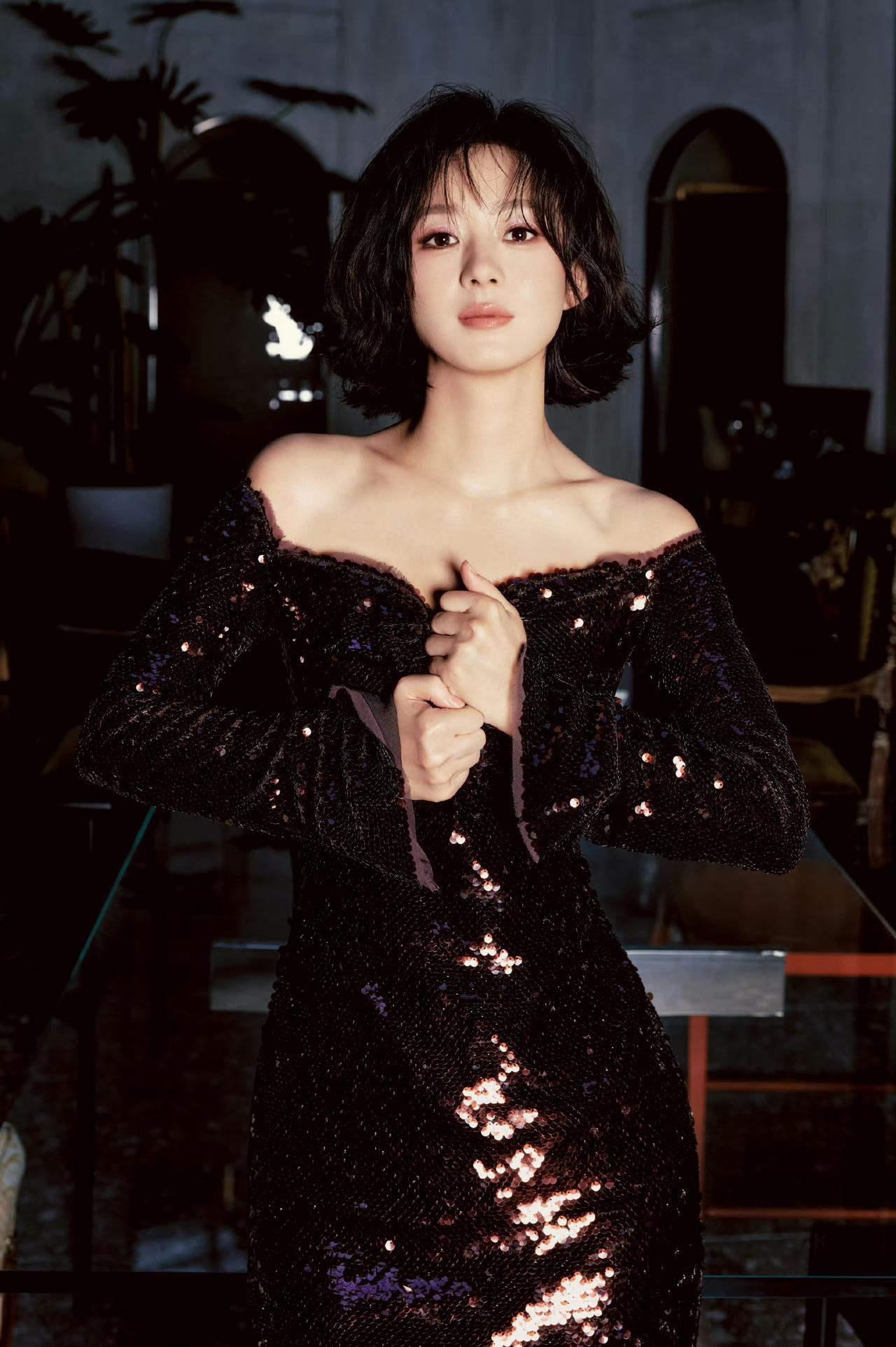 一袭一字肩黑亮片长裙,勾勒出优越肩颈线条,细碎闪片在光影下流光溢彩,慵懒又性感。利落短卷发衬得五官愈发精致,眼神清冷又勾人,是自带气场的暗夜女王,又美又飒!
