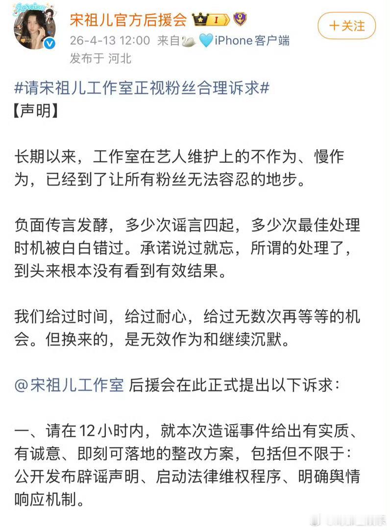 此前,向宋祖儿工作室提出诉求,称:“长期以来,工作室在艺人维护上的不作为、慢作为,已经到了让所有粉丝无法容忍的地步。负面传言发酵,多少次谣言四起,多少次最佳处理时机被白白错过。承诺说过就忘,所谓的处理了,到头来根本没有看到有效结果。请立即整改宣发及舆情团队,拿出专业态度,否则后援会将无法继续配合任何官方动作。” 宋祖儿方否认恋情