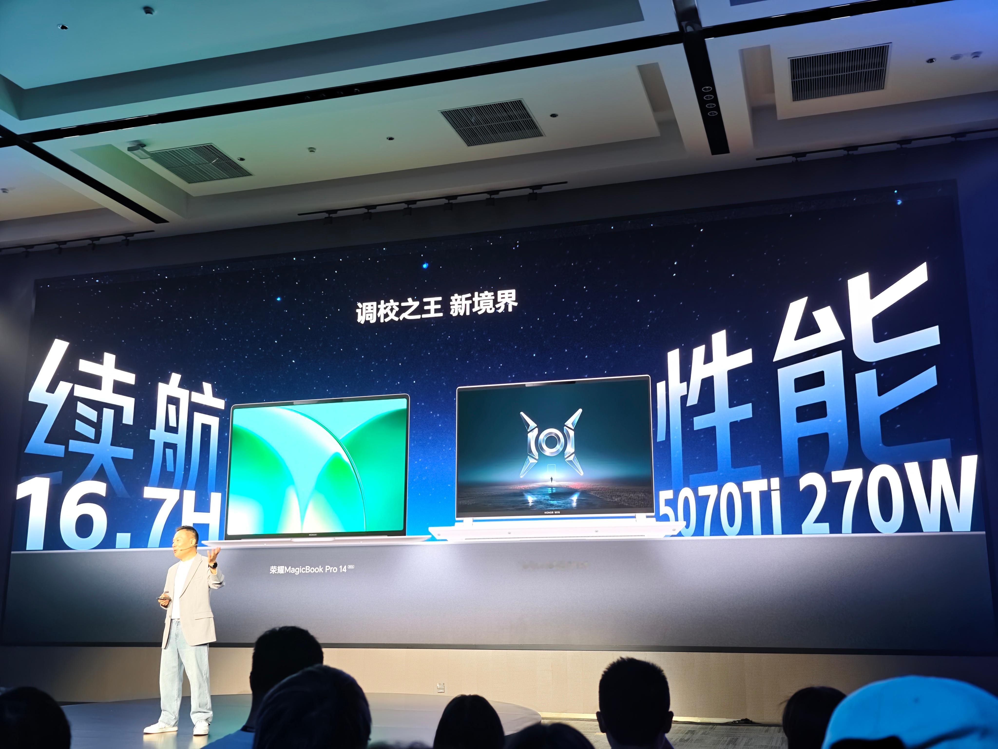 这代荣耀MagicBook Pro 14续航干到了16.7小时,荣耀WIN游戏本H9 5070Ti性能干到了270W,同时也带来了丰富的配件产品