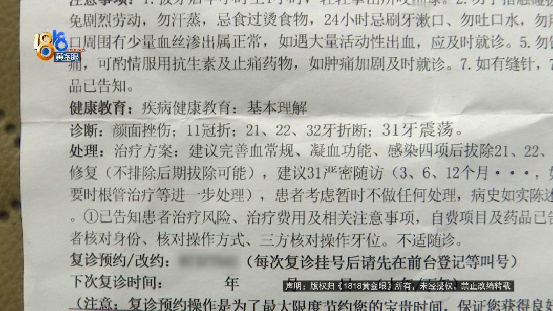 到了医院一检查,医生表示断裂的牙齿只能全部拔掉重新种植,一颗的费用大概在7000元左右。