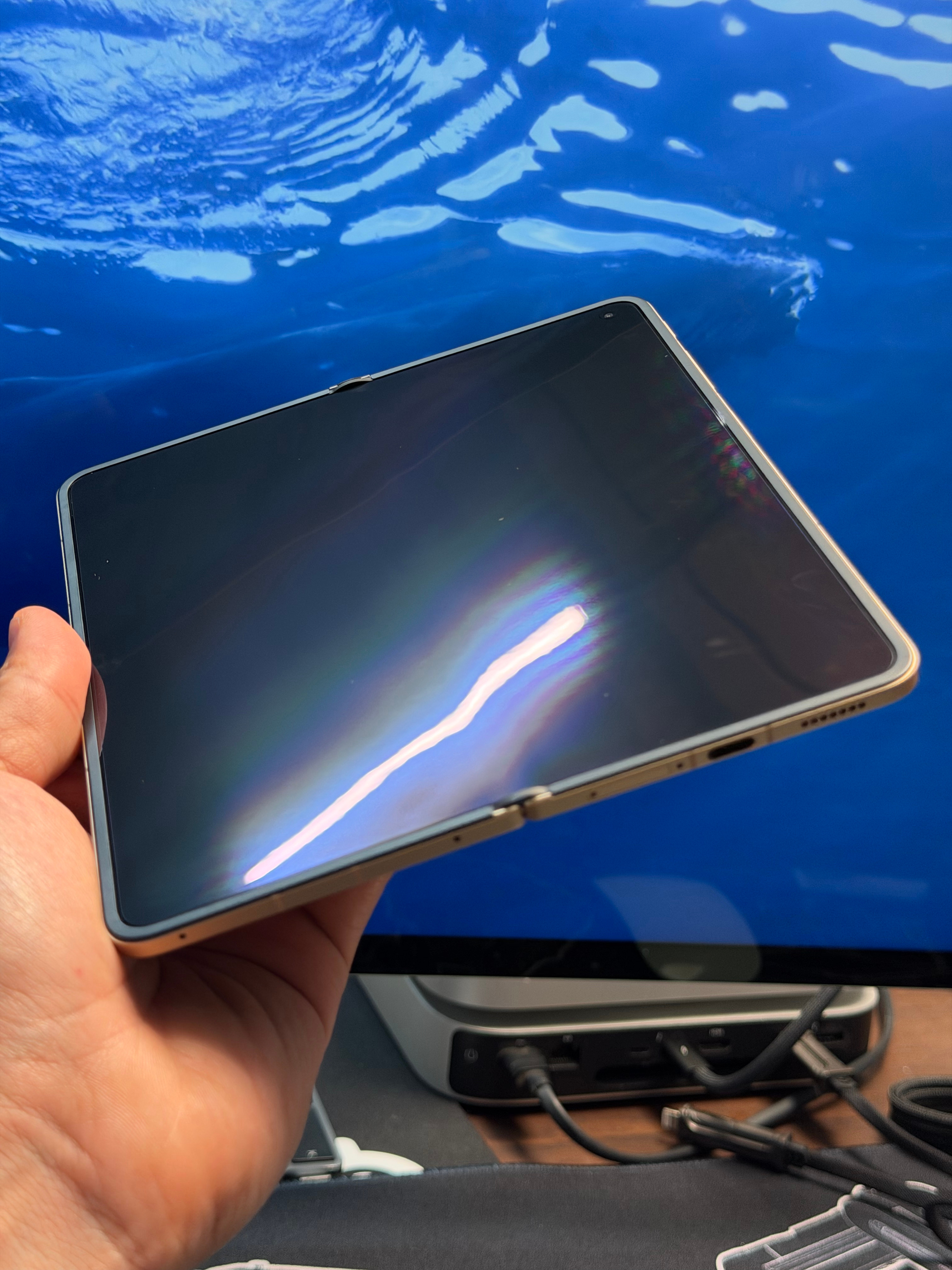 最终还是从 OPPO N5 换成 N6从只有铰链是钛合金,升级到边框都是钛合金,上手明显轻了,原来 N5 机身太薄带来的硌手感也好了(边缘弧度做了修正)随机附送了两片式凯夫塔超薄手机壳,N5 是有点厚的单边皮壳最震撼的还是折叠屏中间的坑“几乎”填平了,平得有点不适应 (图 4 是 N6,图 5 是 N5)