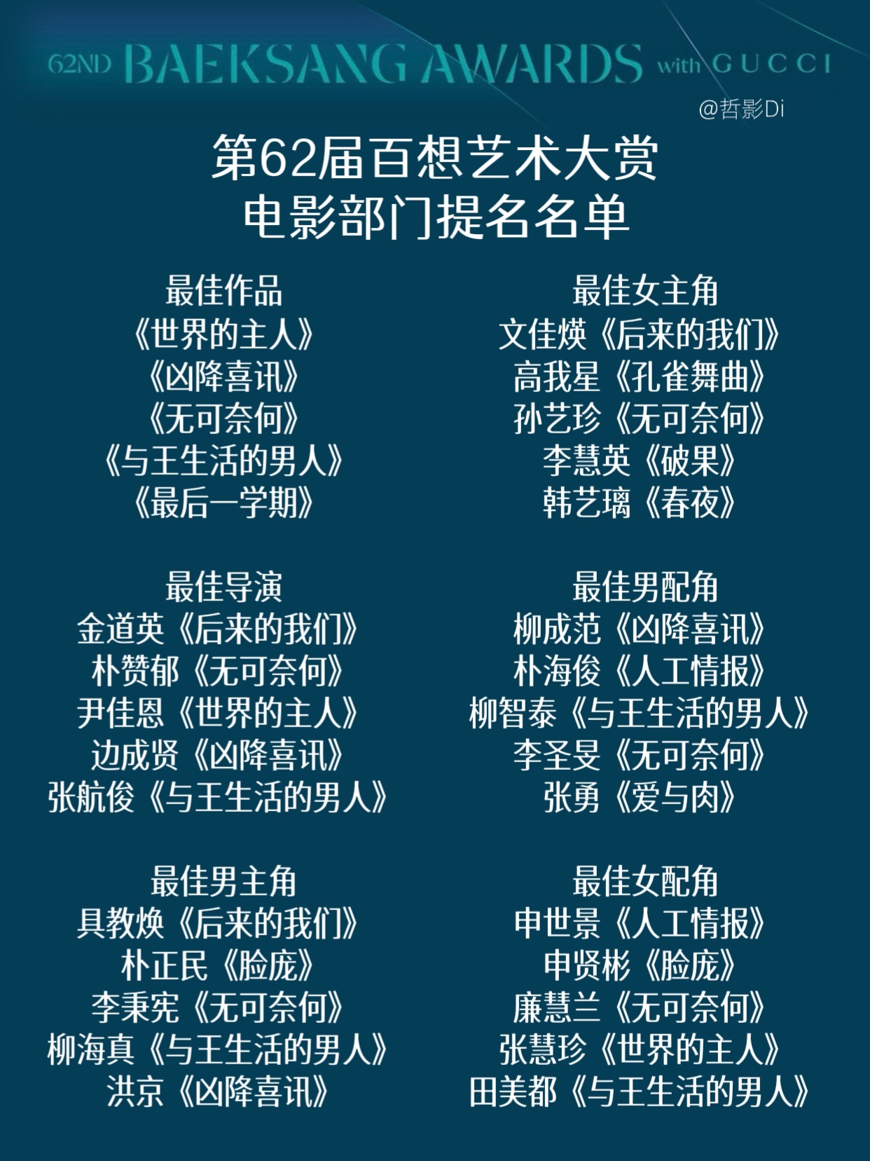 第62届百想艺术大赏公布电影部门提名名单,影片《无可奈何》以7项提名领跑,《凶降喜讯》《与王生活的男人》则均获6项提名紧随其后,《世界的主人》获得5项提名名单。本届百想艺术大赏颁奖典礼将于5月8日举行。完整提名名单见图1、图3。
