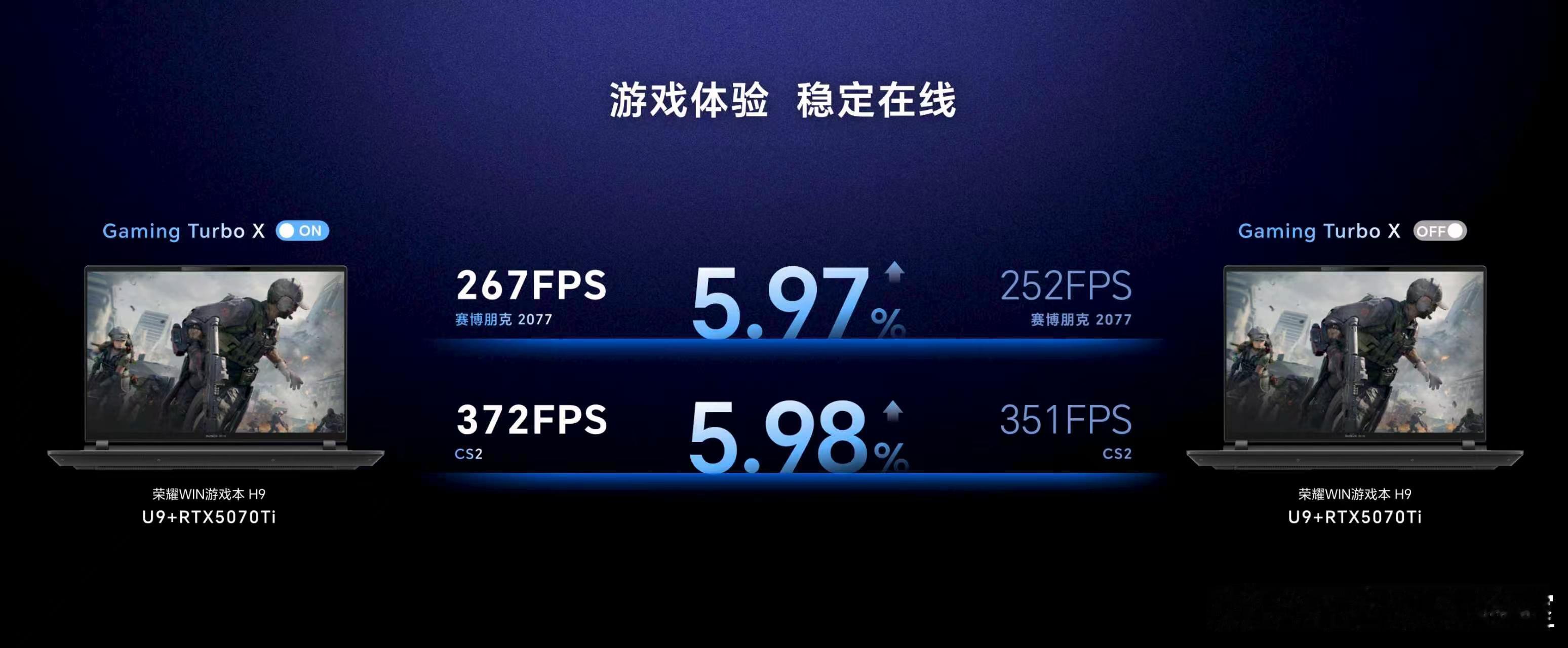 荣耀WIN游戏本正式亮相 ,搭载的Gaming Turbo X让游戏与生产力双提速,可提升《赛博朋克2077》帧率5.97%、缩短AutoCAD 3D文件导出时间17.9%。荣耀WIN游戏本带来三网加速、3D游戏防眩晕、静音高性能3.0等行业领先技术,以全方位细节创新极大地提升玩家游戏体验。