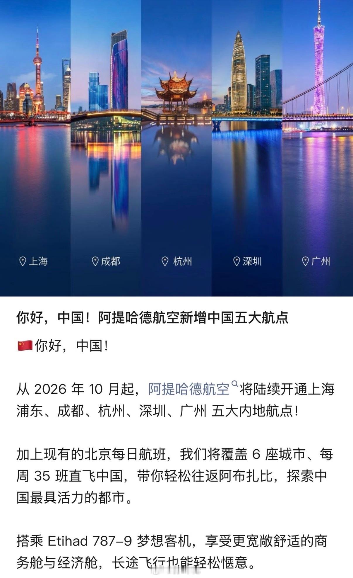 新鹏城胸前广告发力了!阿提哈德航空新增深圳等5个航点阿提哈德航空官宣,将从10月起一口气开通中国内地5个航点,加速布局中国市场:上海,成都,杭州,深圳,广州!深圳新鹏城阿提哈德航空阿提哈德 南京