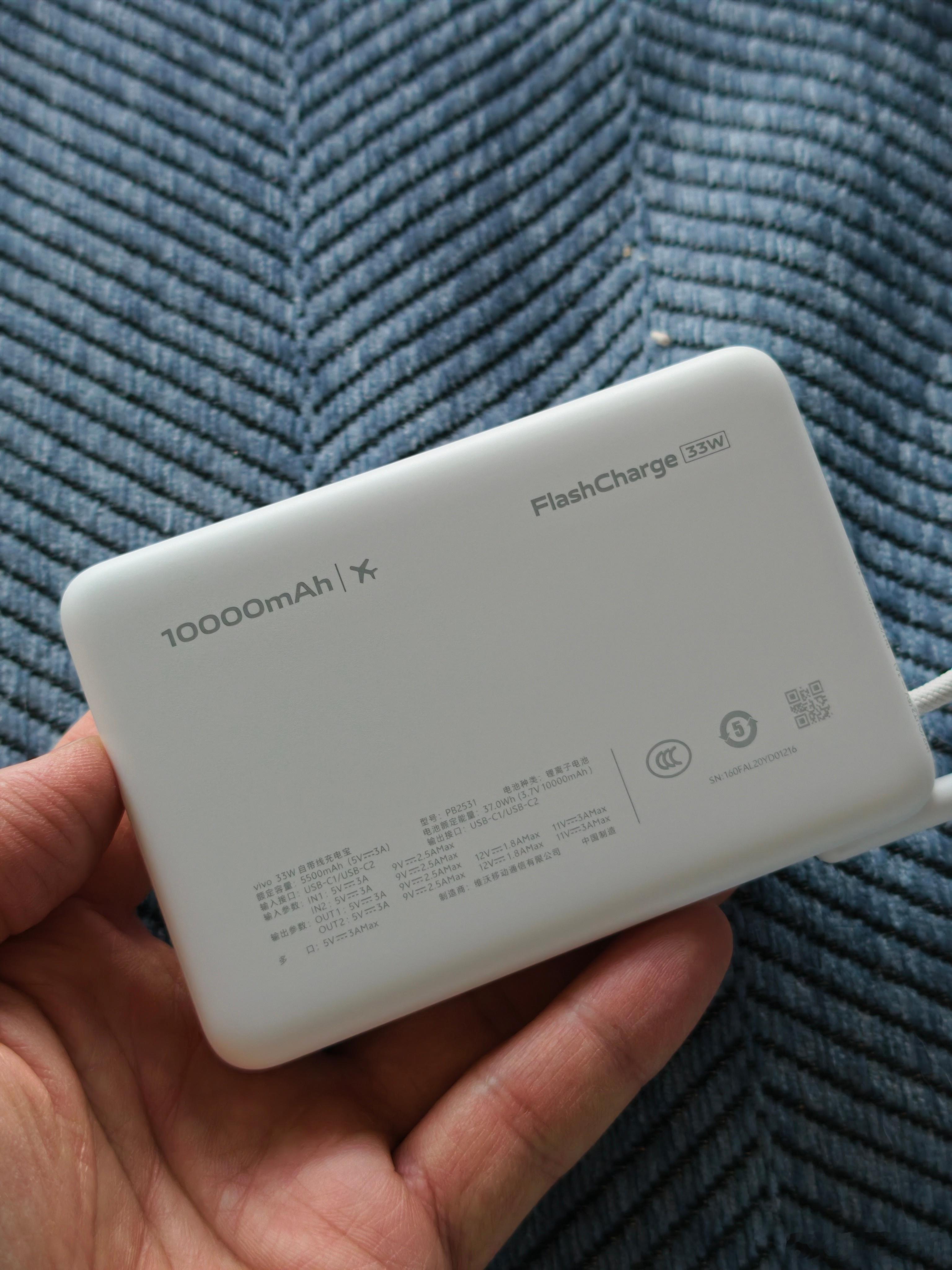 网上买了个蓝厂的一万毫安33W快充的充电宝真不错,比较轻巧,自带线,还是横着的接
