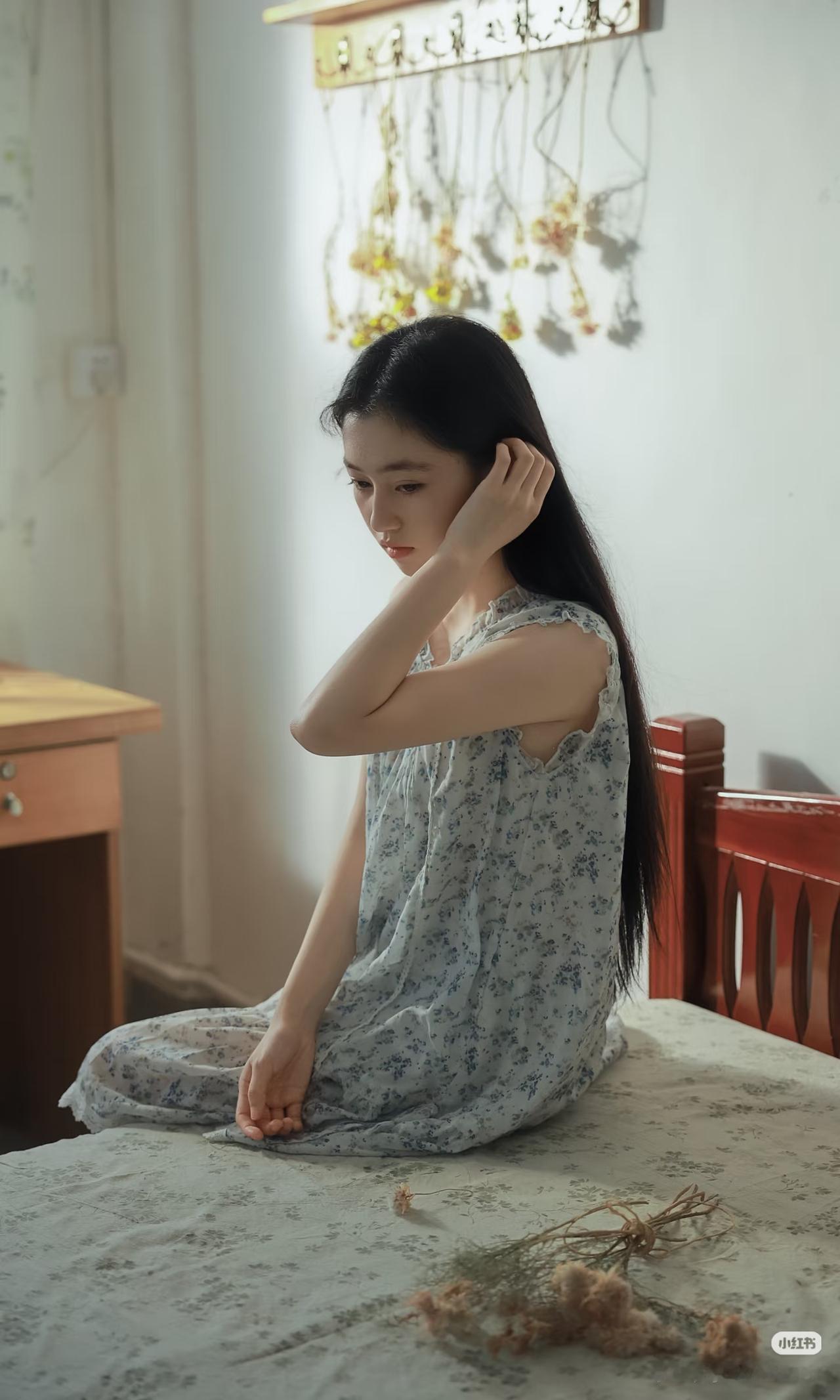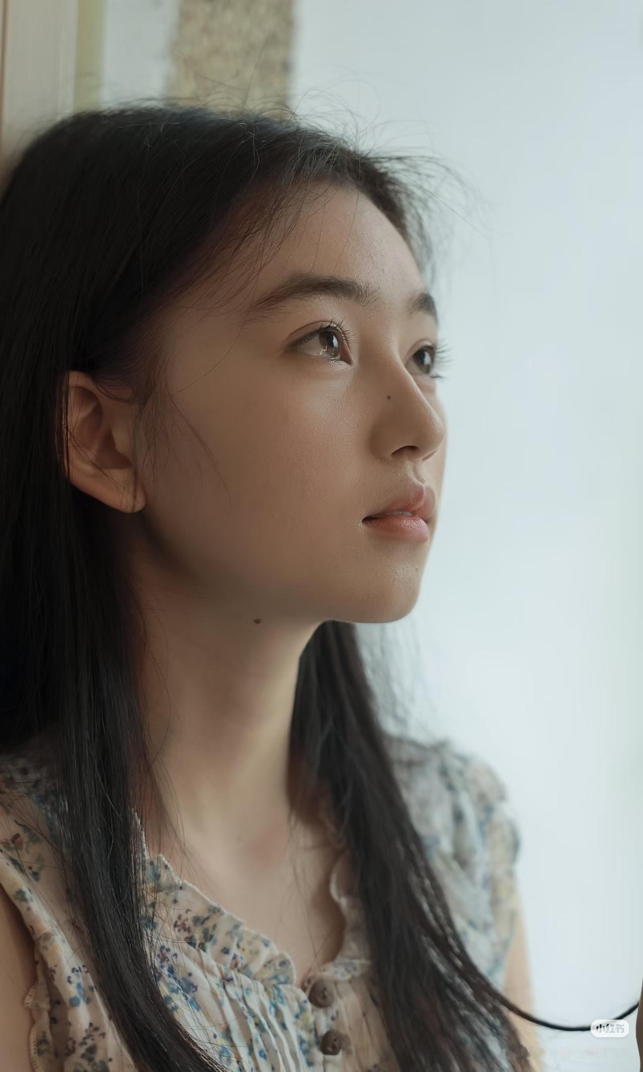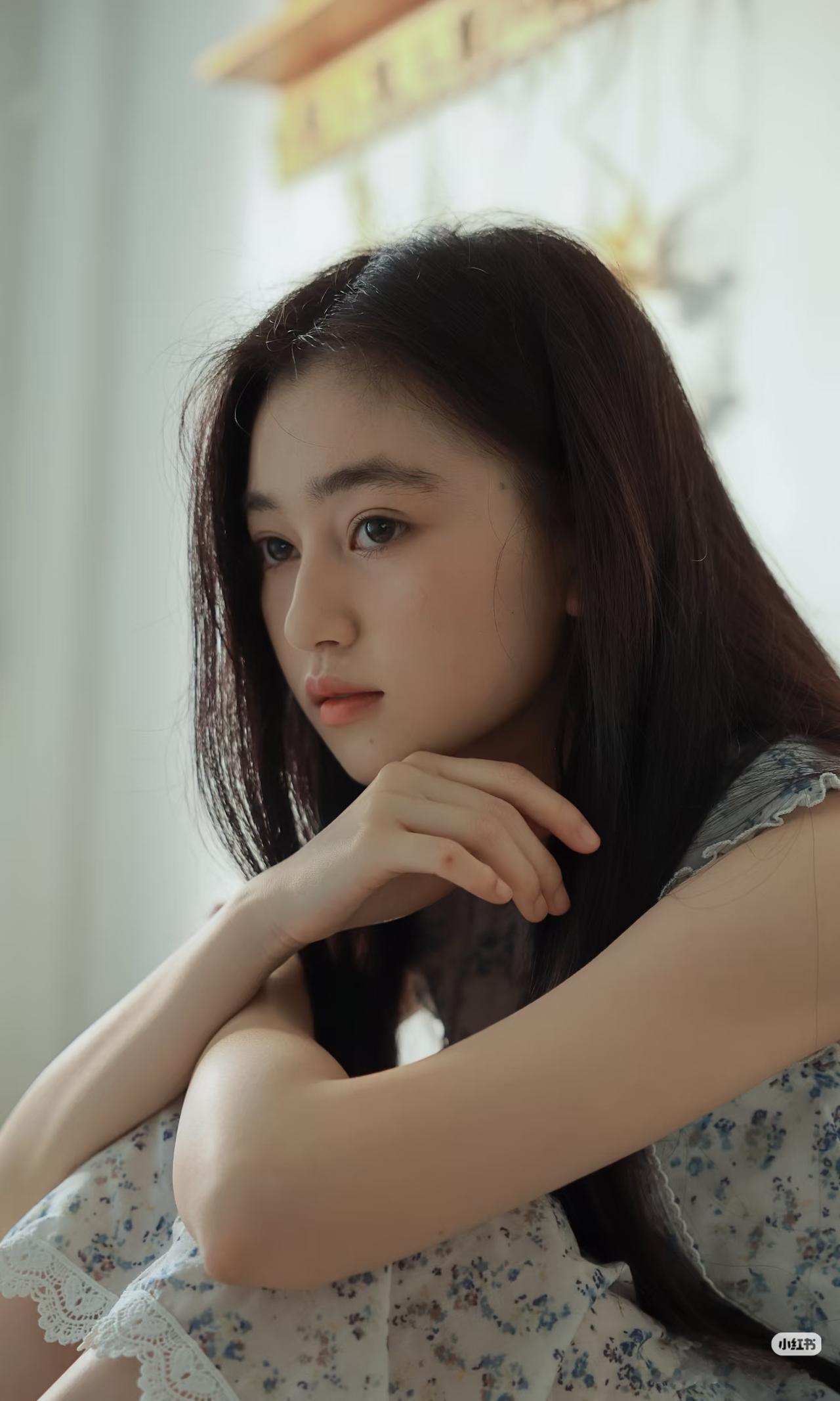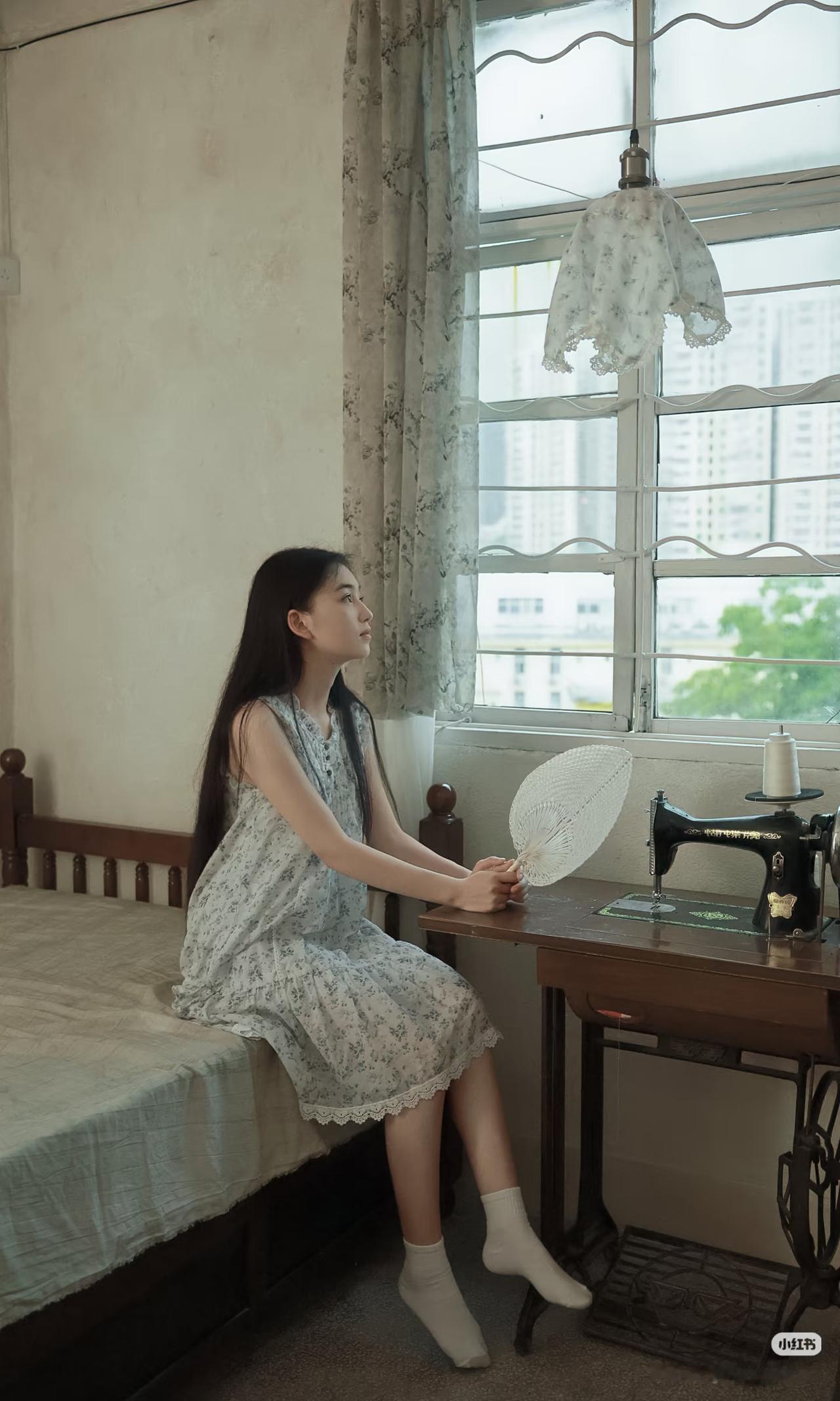 少女静坐窗边,手持团扇,沉思悠远。
