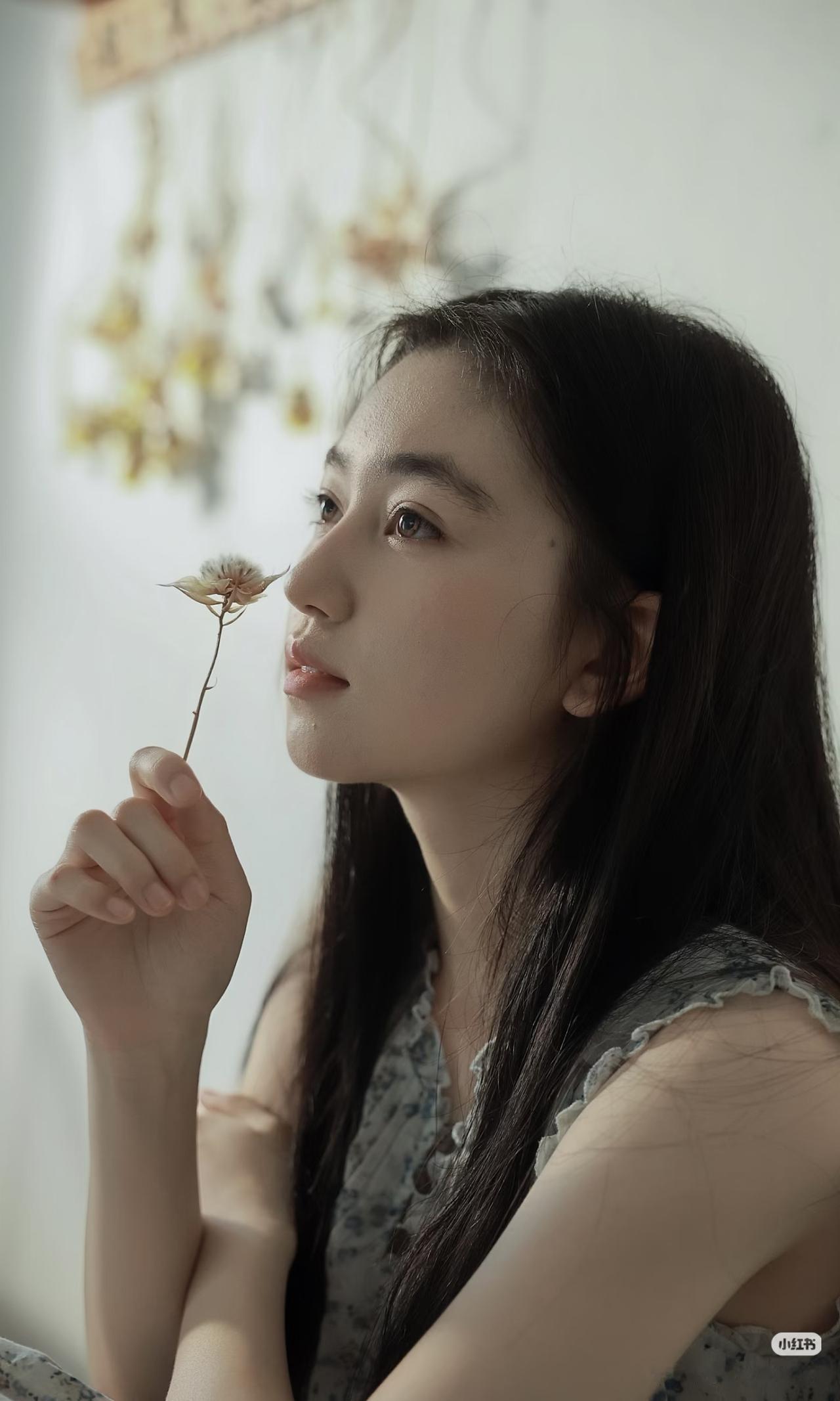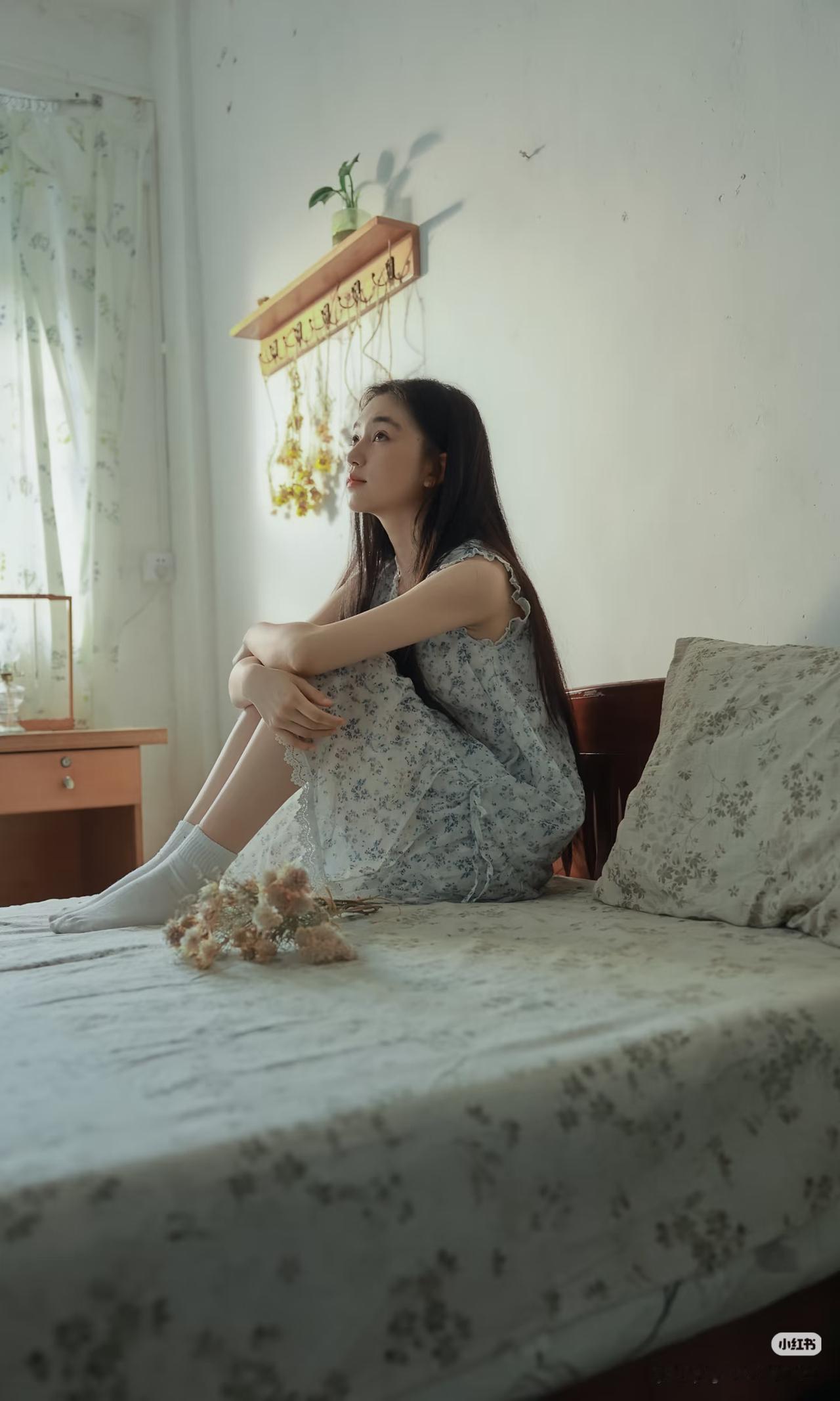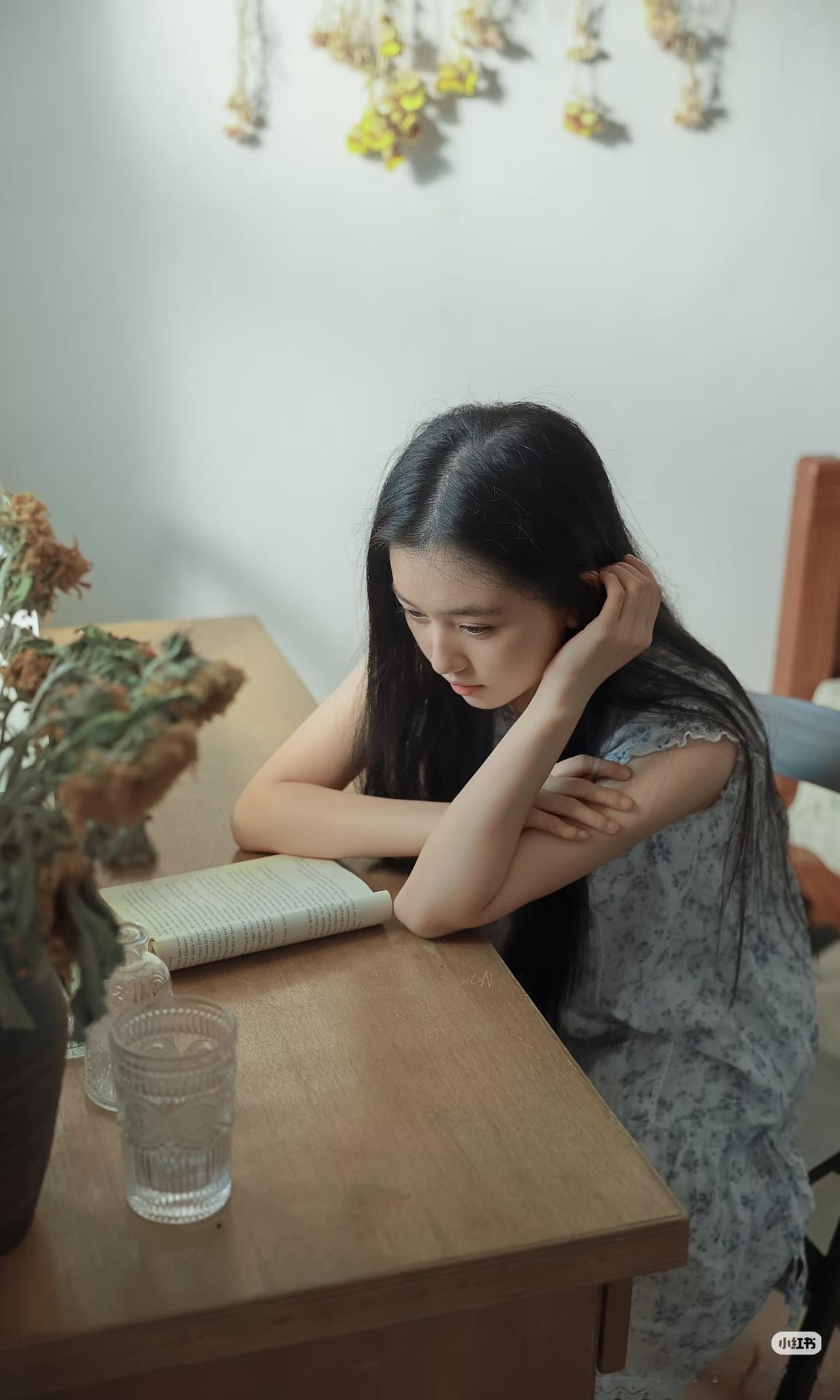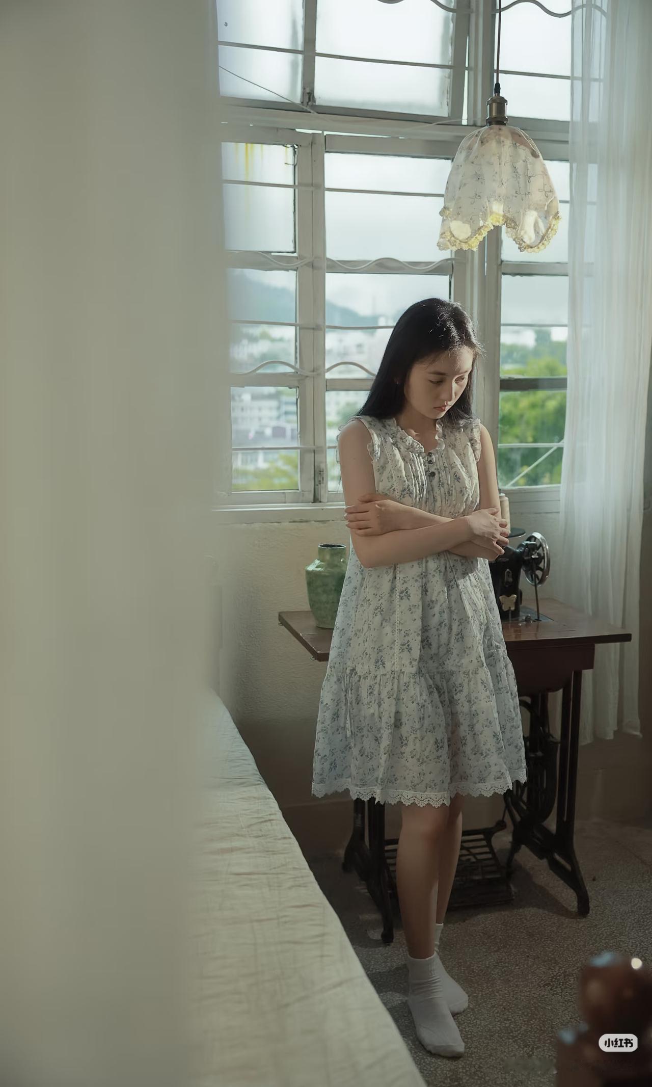 少女静坐窗边,手持团扇,沉思悠远。