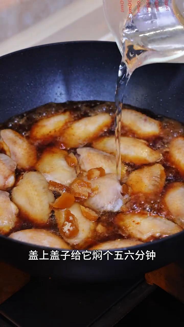 ·再来调味,加上一勺半的头抽,还有切碎的黄片糖,开水差不多到鸡翅面就好,盖上盖子给它焖个五六分钟。