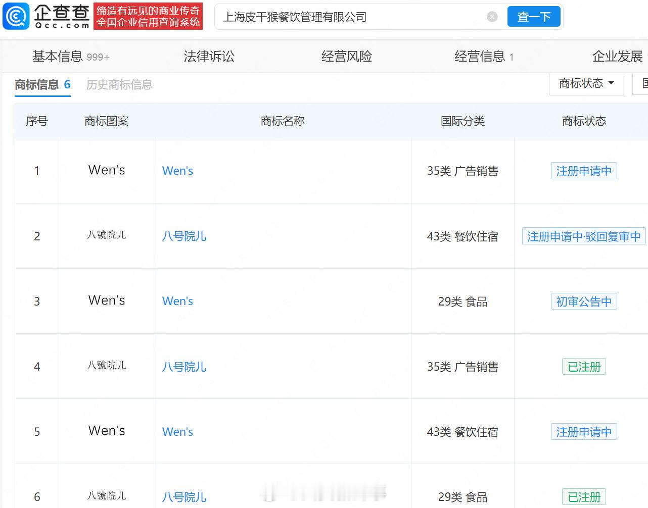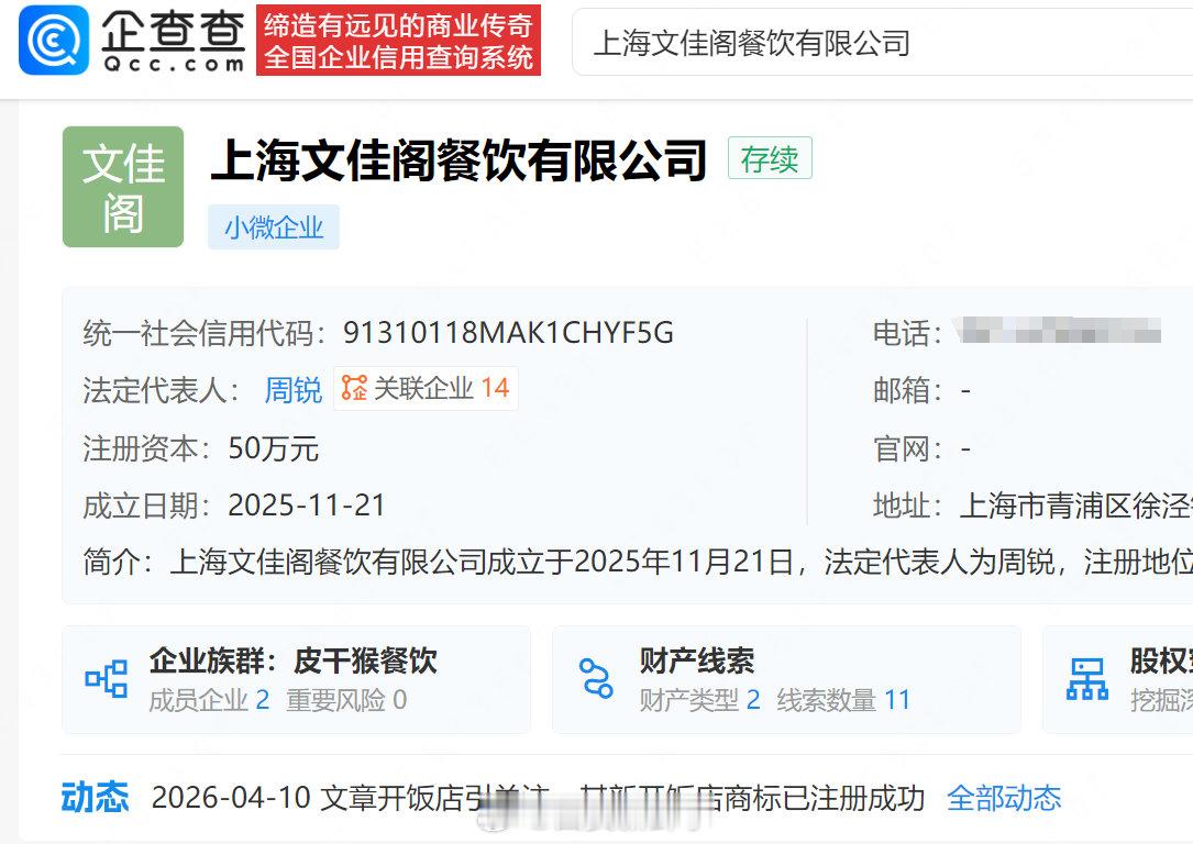 企查查APP显示,“八号院儿”面馆关联的上海文佳阁餐饮有限公司成立于2025年11月,法定代表人为周锐,注册资本50万元,经营范围为餐饮服务,由上海皮干猴餐饮管理有限公司全资持股,后者由文章持股59%。知识产权信息显示,该公司已申请注册多枚“八号院儿、“Wen's”商标,国际分类涉及食品、广告销售等,部分商标已注册成功。