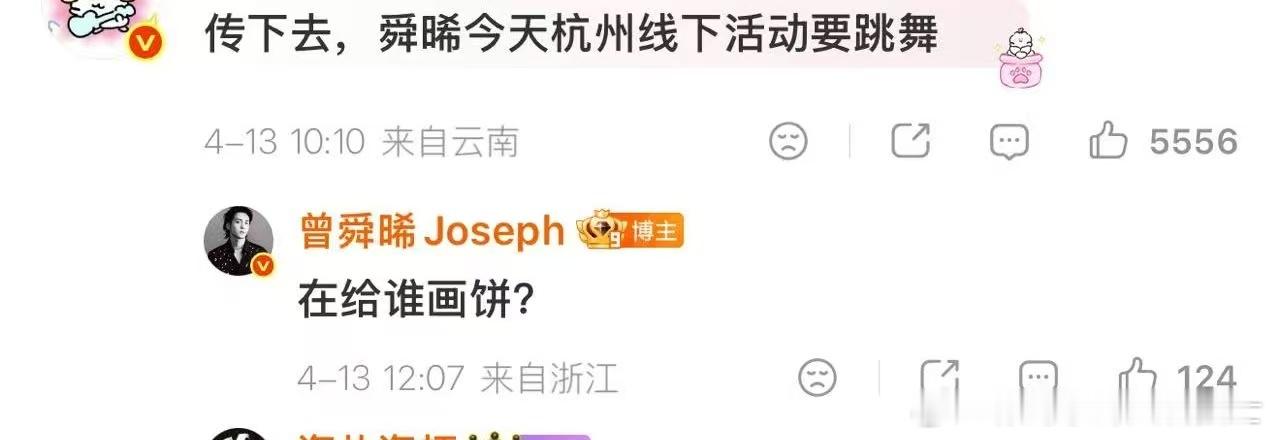 曾舜晞问粉丝在给谁画饼曾舜晞疑似线下表演新歌 新歌+线下,粉丝狂喜。结果曾舜晞一句“给谁画饼”把大家问懵了。所以,演不演嘛?