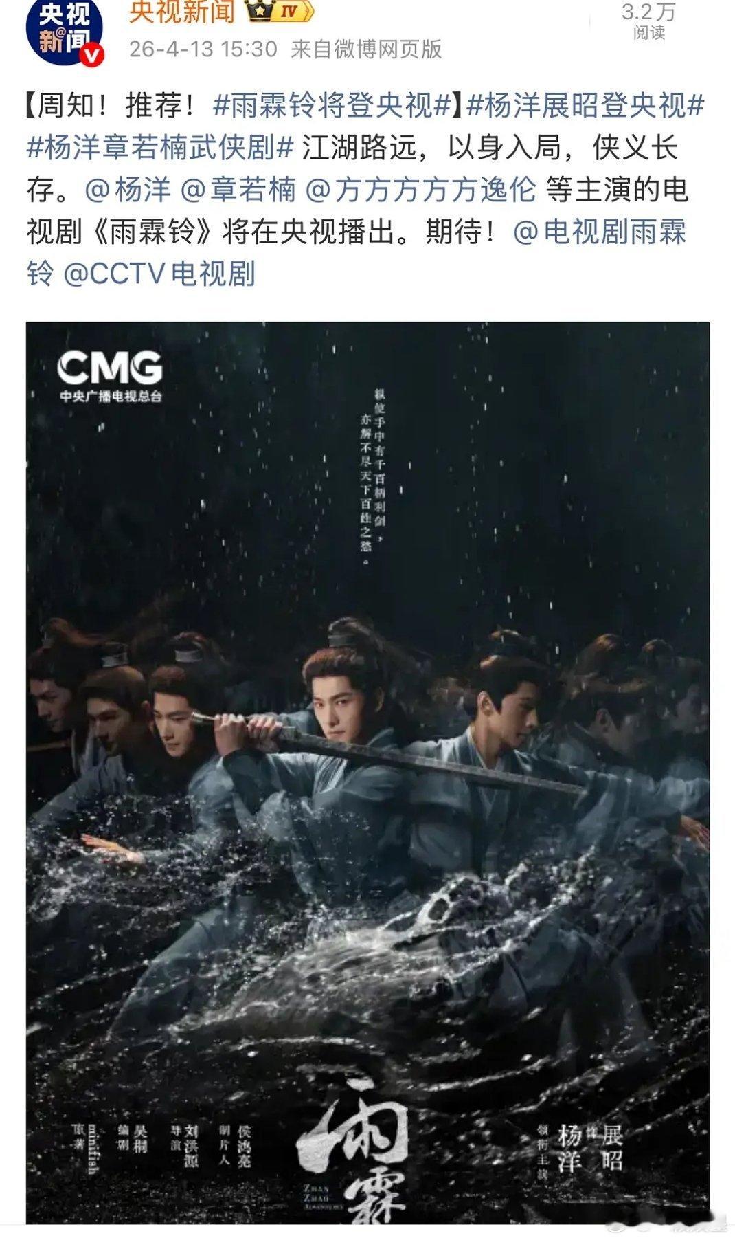 杨洋雨霖铃即将登录央视,yyls的打戏对我眼睛太友好了,展昭展昭快来~