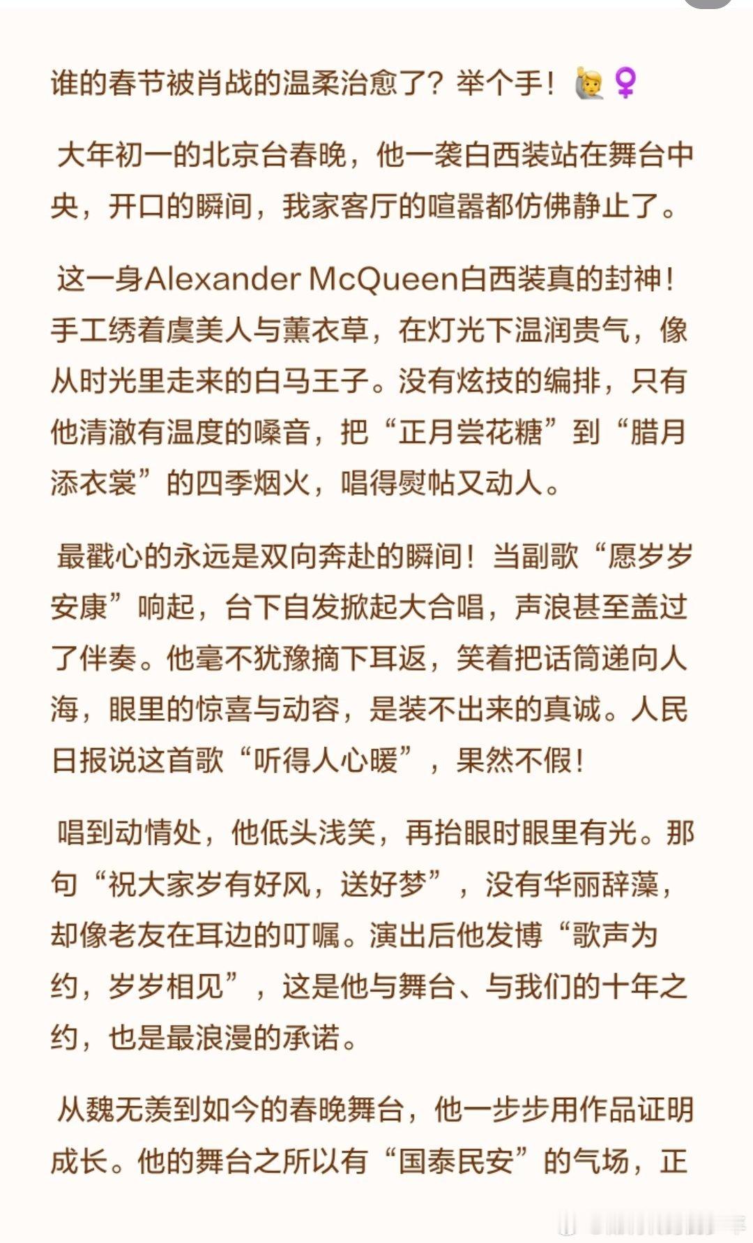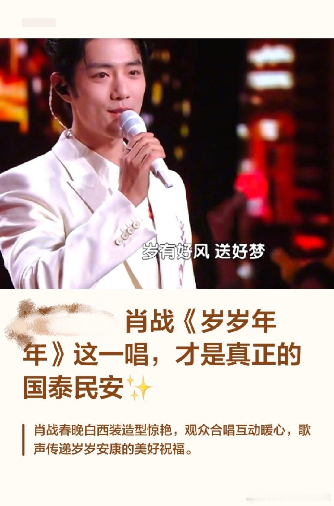 肖战岁岁年年角逐年度优秀歌曲肖战在北京卫视春晚唱的《岁岁年年》是今年春晚蕞好的节目,没有之一💯。他温暖治愈的嗓音一出来,心里立刻一股踏实安定感🥹肖战岁岁年年角逐年度优秀歌曲