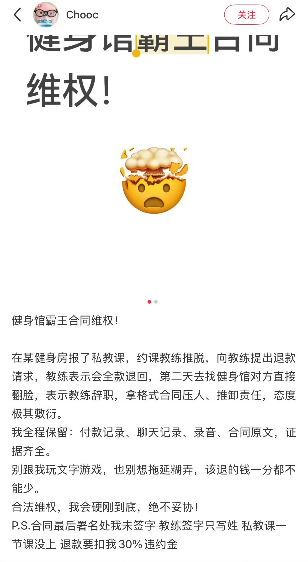 宁波网友称约私教课教练推脱想退款又遇阻,健身馆霸王合同维权! 在某健身房报了私教课,约课教练推脱,向教练提出退款请求,教练表示会全款退回,第二天去找健身馆对方直接翻脸,表示教练辞职,拿格式合同压人、推卸责任,态度极其敷衍。我全程保留:付款记录、聊天记录、录音、合同原文,证据齐全。别跟我玩文字游戏,也别想拖延糊弄,该退的钱一分都不能少。合法维权,我会硬刚到底,绝不妥协!P.S.合同最后署名处我未签字 教练签字只写姓 私教课一节课没上 退款要扣我30%违约金