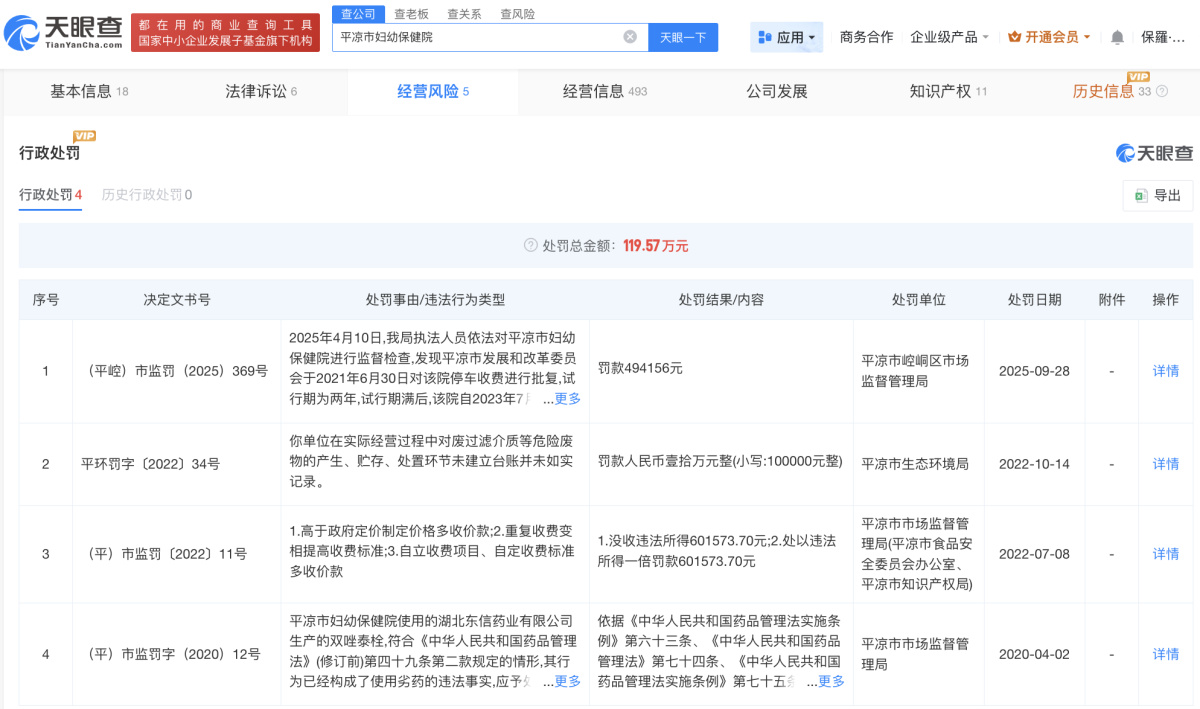 经营风险信息显示,平凉市妇幼保健院现存多条行政处罚信息。其中,记者注意到,该医院曾因使用劣药、使用过期医疗器械,且存在高于政府定价制定价格多收价款、重复收费变相提高收费标准、自立收费项目、自定收费标准多收价款等行为,多次被平凉市市场监督管理局、平凉市崆峒区市场监督管理局处罚。