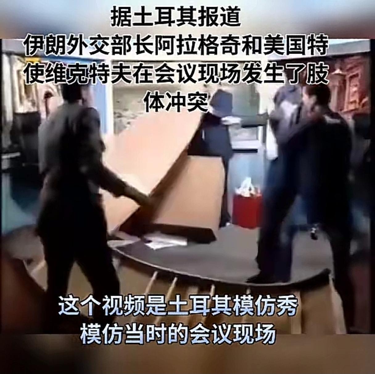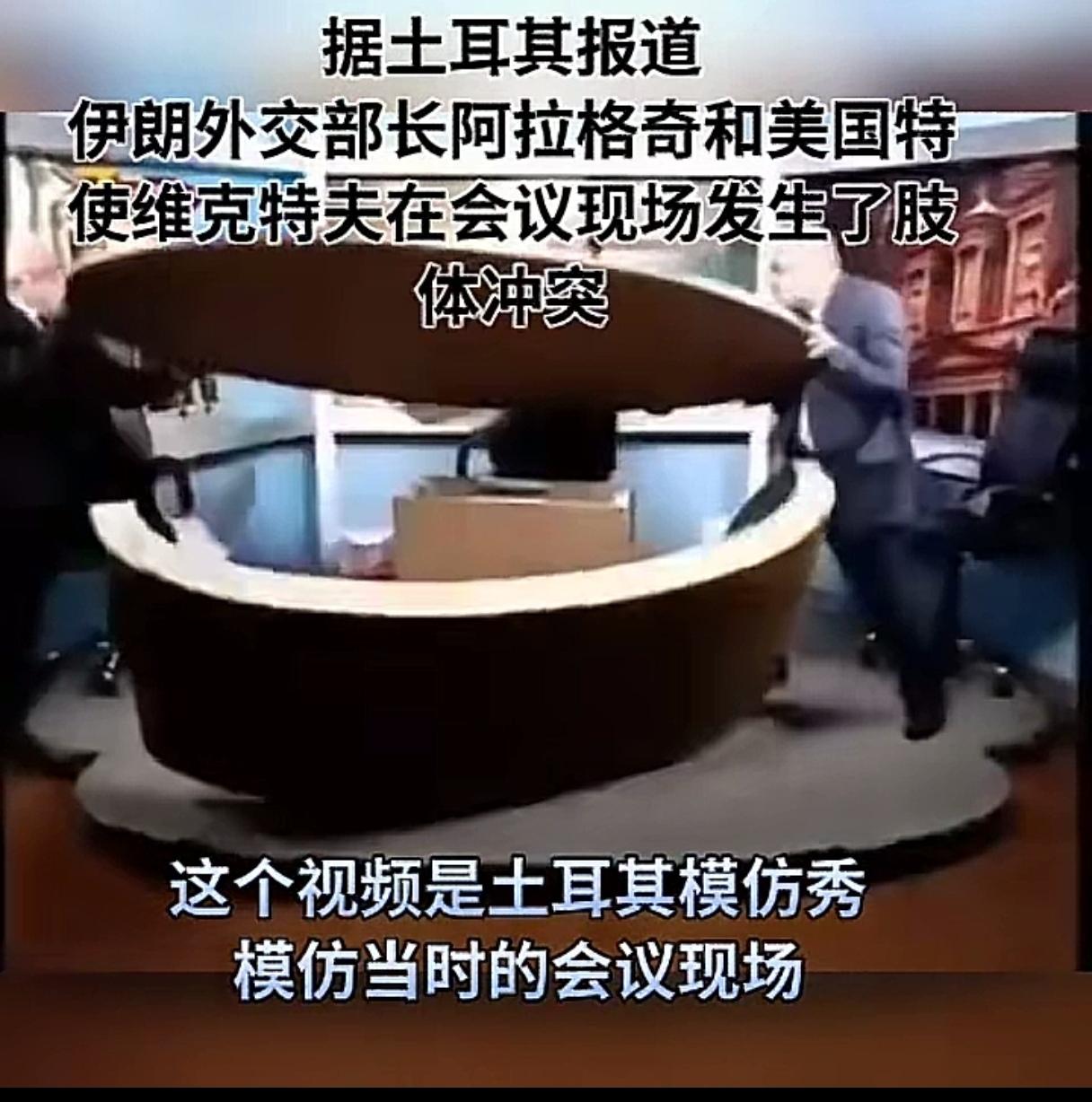 据土耳其媒体报道,美以谈判期间,发生了一件八卦:伊朗外长阿拉格奇和美国特使威特科夫发生了肢体冲突,通俗点说就是两个人一言不合掀桌子了,不仅掀了桌子,两个人还打了一架。路边摊小报说的绘声绘色,说威特科夫挨揍了,都流鼻血了。土耳其八卦小报为了让传闻更吸人眼球,还AI了一段视频。网友们在吃瓜的时候,真心感叹一句:巴基斯坦的桌子质量太撇,绝对不是实木的。
