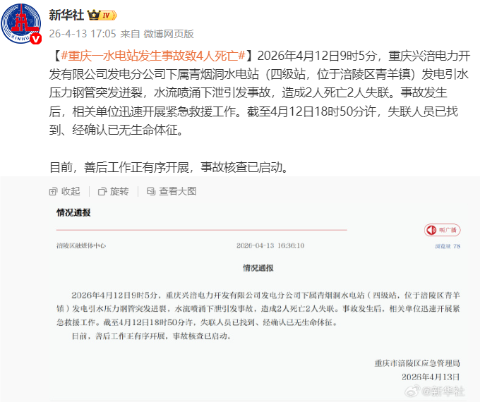 2026年4月12日9时5分,重庆兴涪电力开发有限公司发电分公司下属青烟洞水电站(四级站,位于涪陵区青羊镇)发电引水压力钢管突发迸裂,水流喷涌下泄引发事故,造成2人死亡2人失联。事故发生后,相关单位迅速开展紧急救援工作。截至4月12日18时50分许,失联人员已找到、经确认已无生命体征。