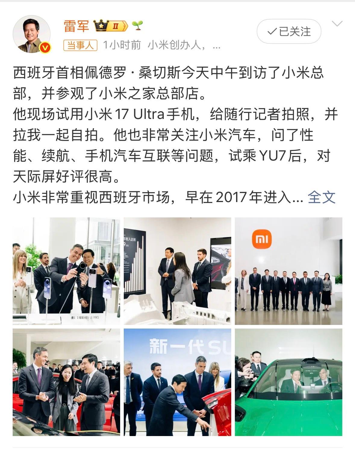 30%的市占率是第一块基石,而新SU7、YU7的被提前试驾,则是中国汽车工业走向世界舞台的预告片。雷军的回应很谦逊,但事实很硬气,小米正成为中国科技全球化的新名片。雷军回应西班牙首相参观小米 西班牙首相参观小米科技园