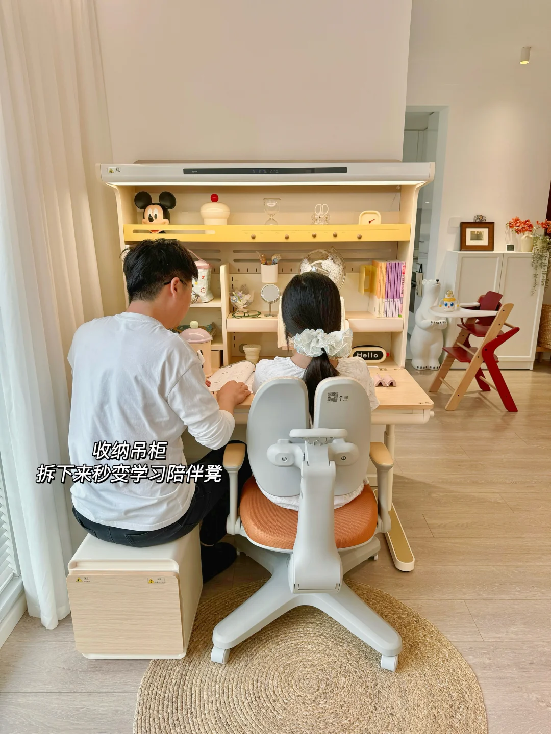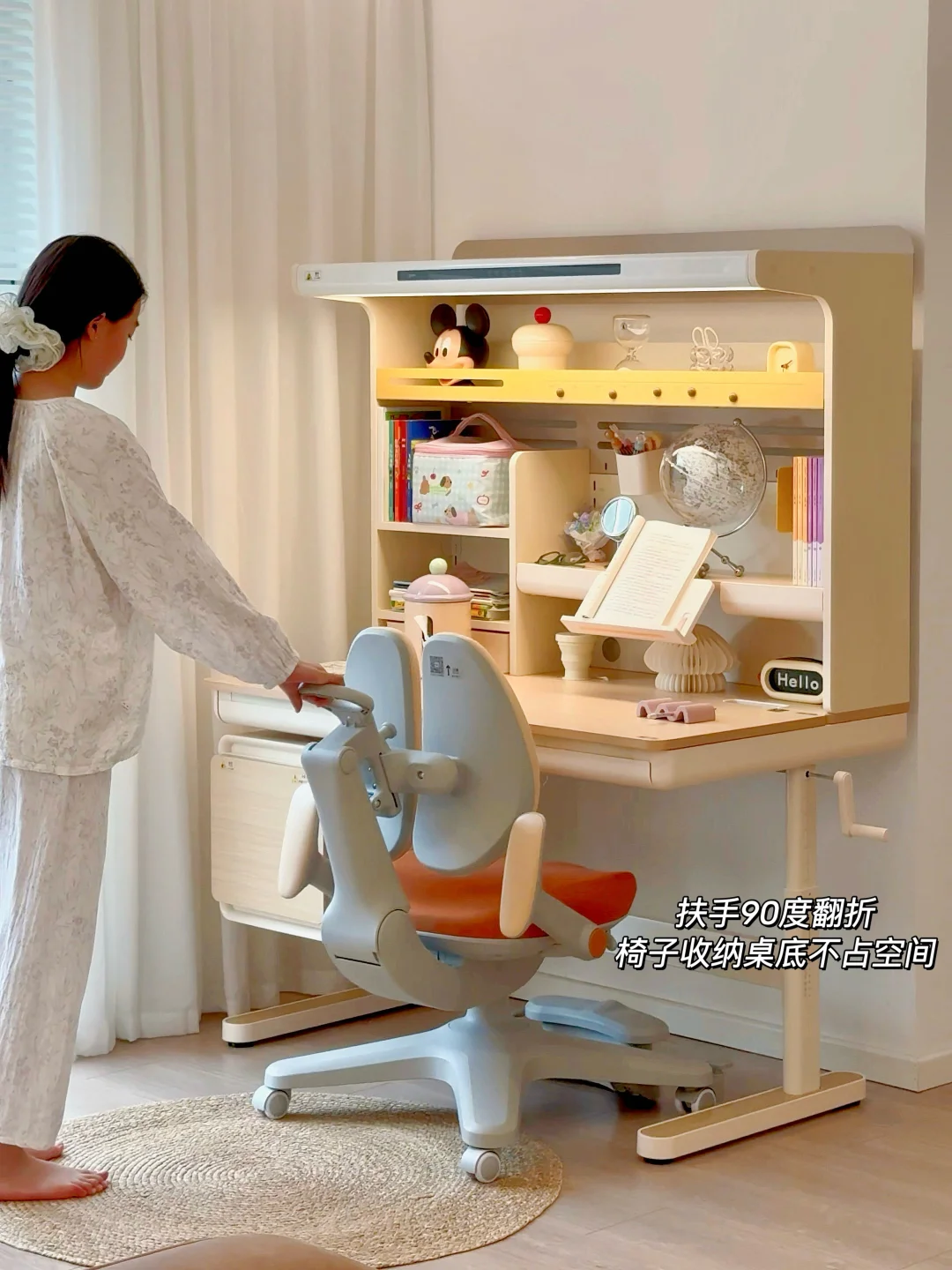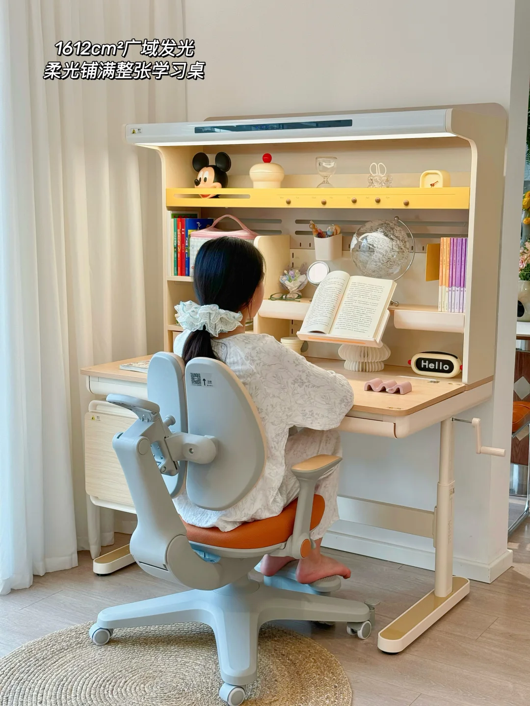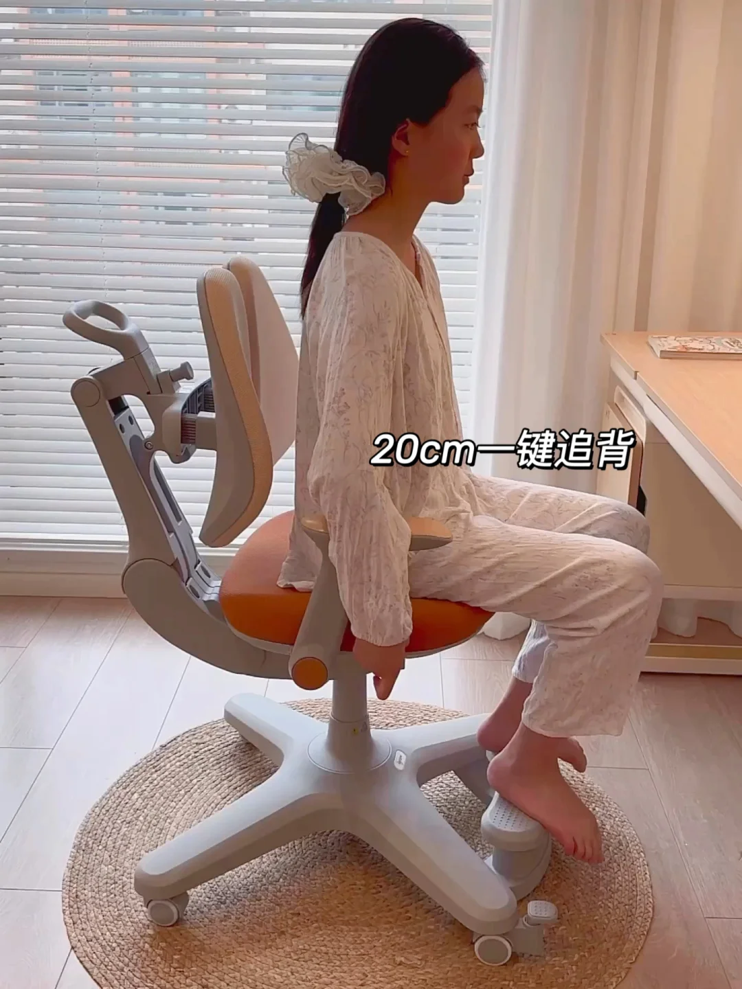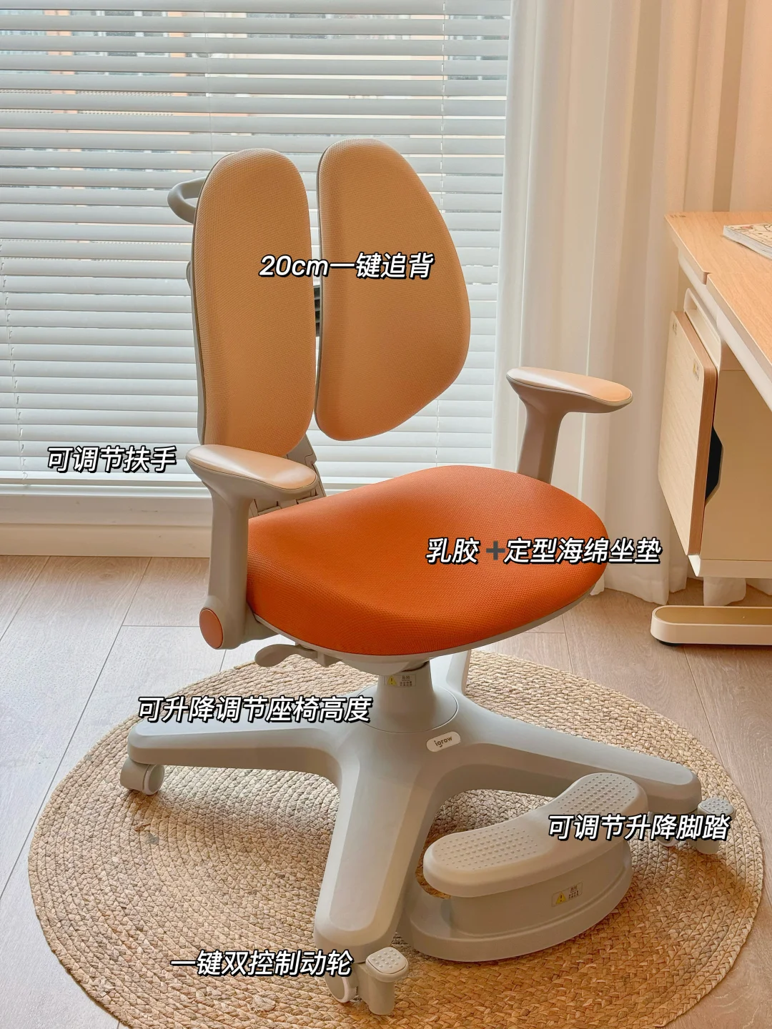 学习椅搭配的是爱果乐星际椅,一键追背功能入座就能全程自动贴合,高度和脚踏都能调节,之前用的普通椅子姐姐长高了之后看书写作业的时候一直驼背,现在调整坐姿全靠它了。