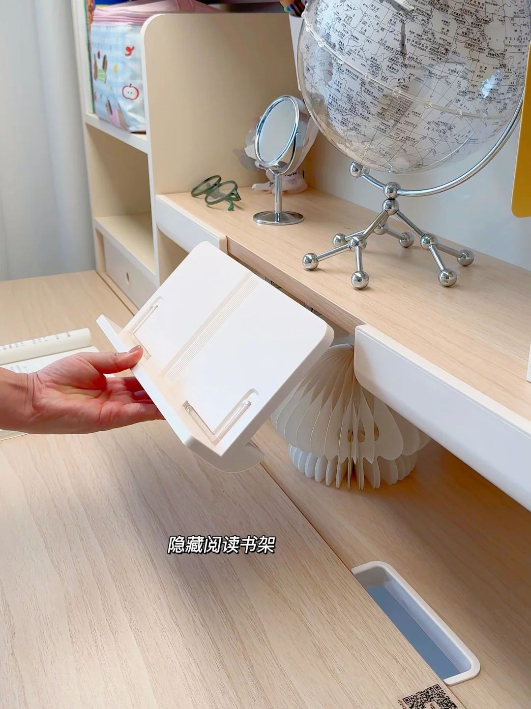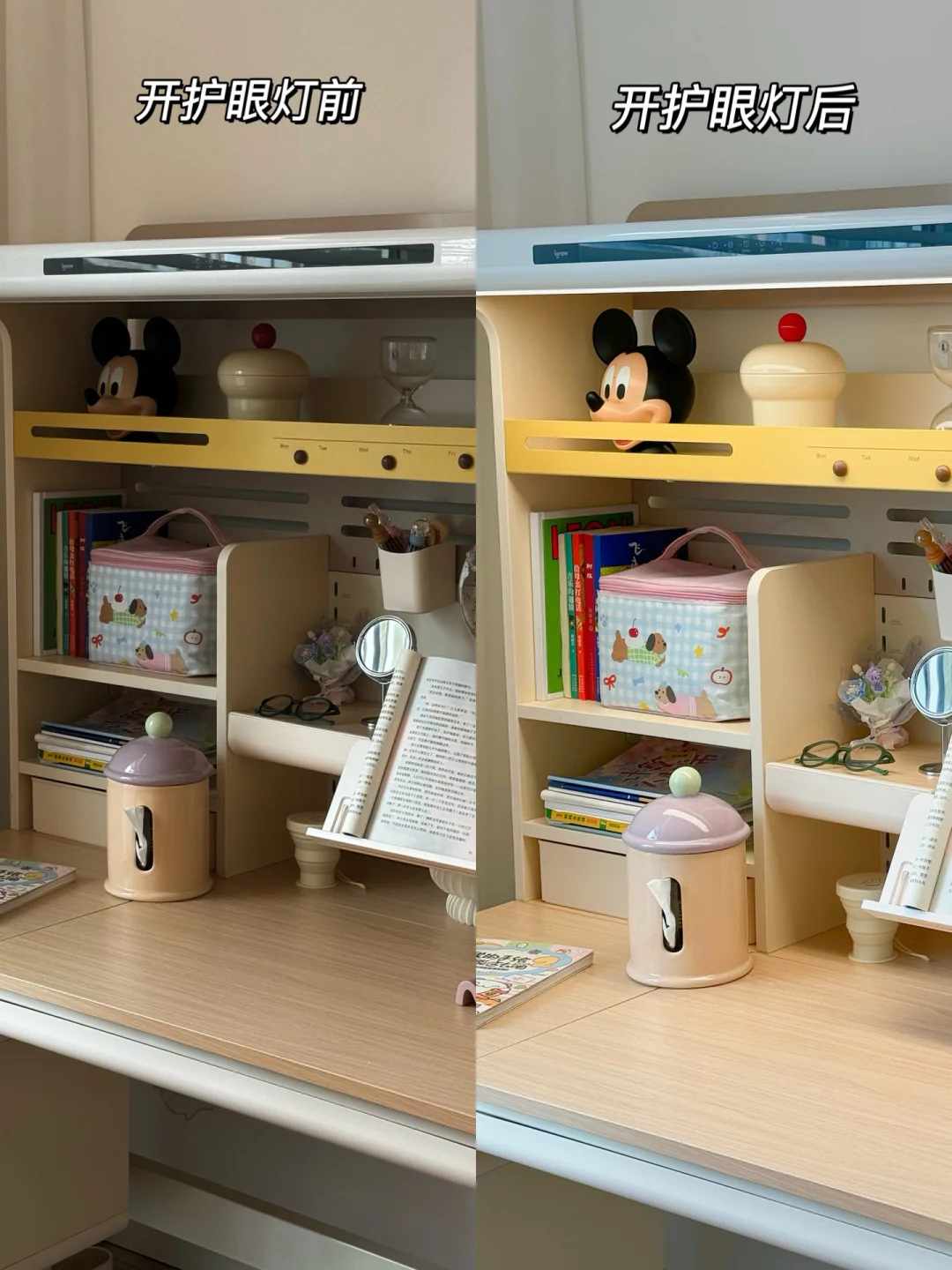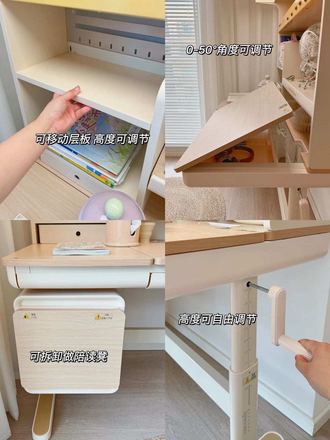 收纳这块就更不用多说了,4层加高书架,15个分区,加上层板还可以自由调节,像大绘本、学习机都能有它自己恰到好处的位置,所有物品都能分门别类的归纳整理好,简直是小户型学习区整齐的神!