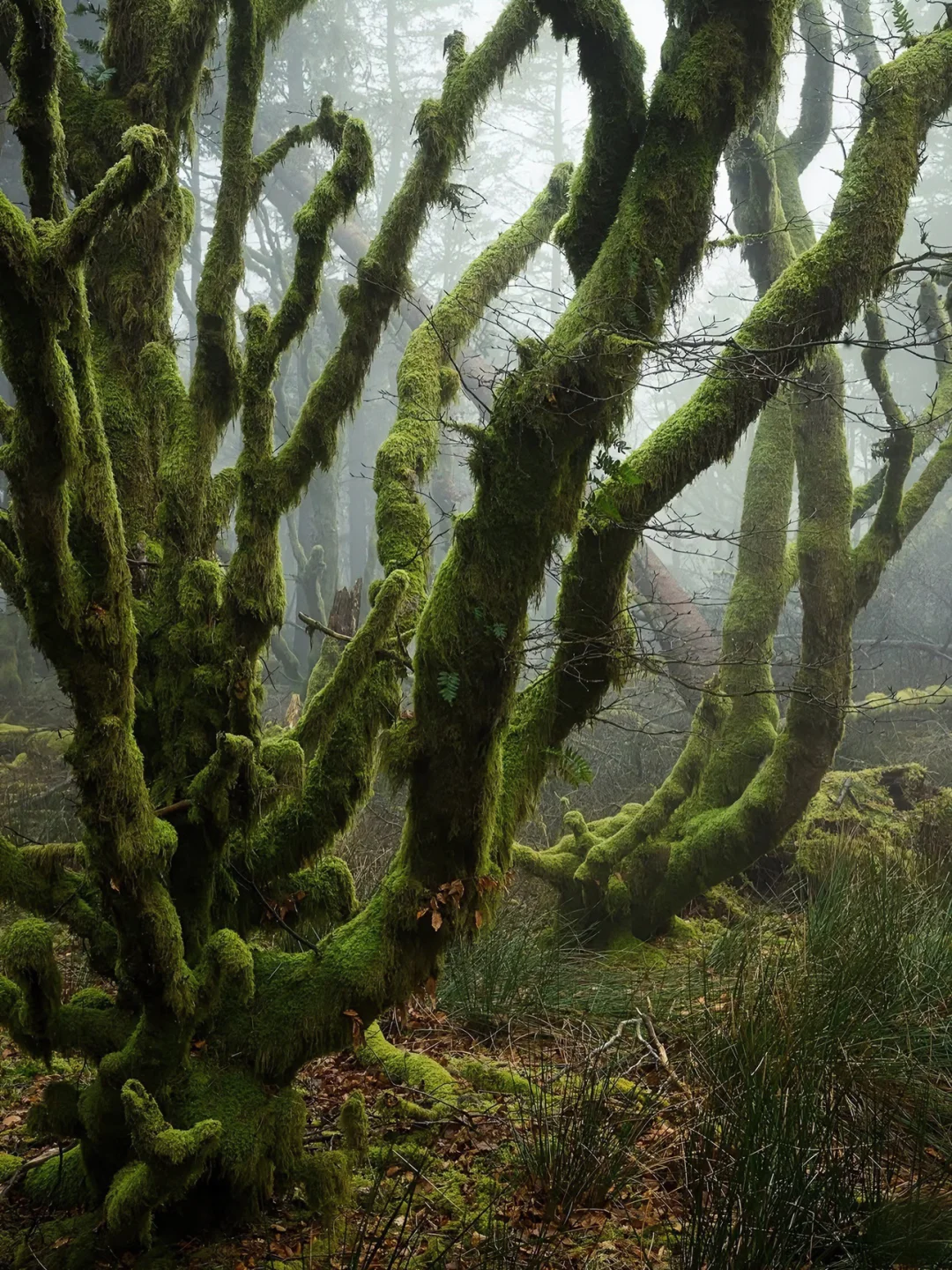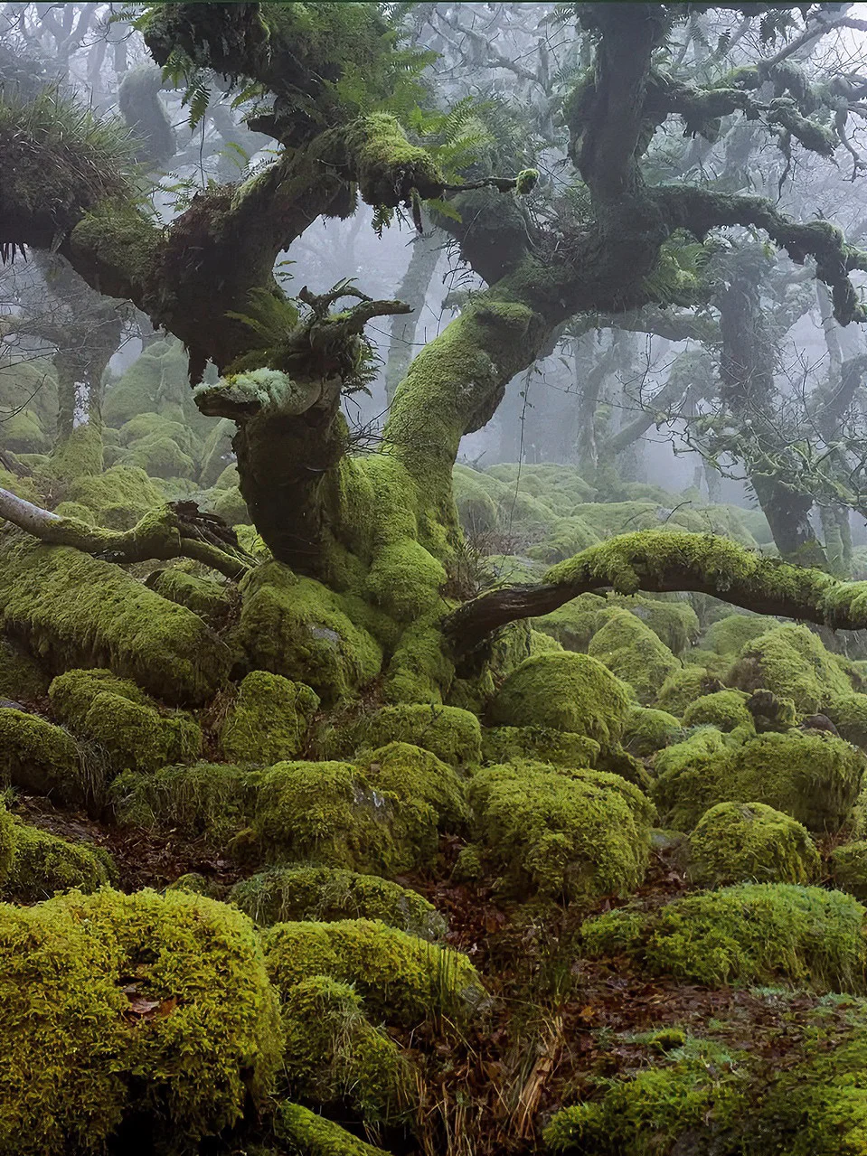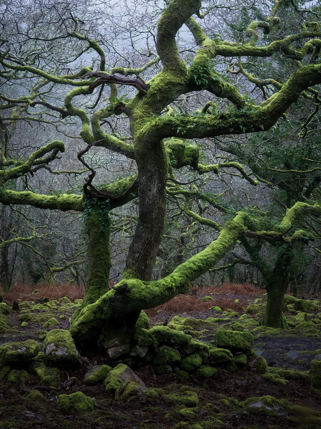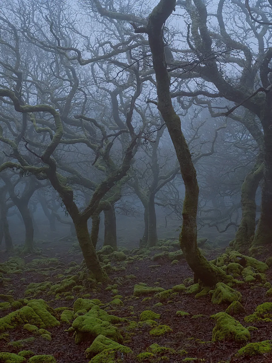 它是英国海拔最高的古老橡树林之一,据说这里的树木是德鲁伊的遗迹,长得歪七扭八,像极了《哈利波特》里的打人柳,满身挂满了灰色的苔藓,像老人的胡须一样垂下来。