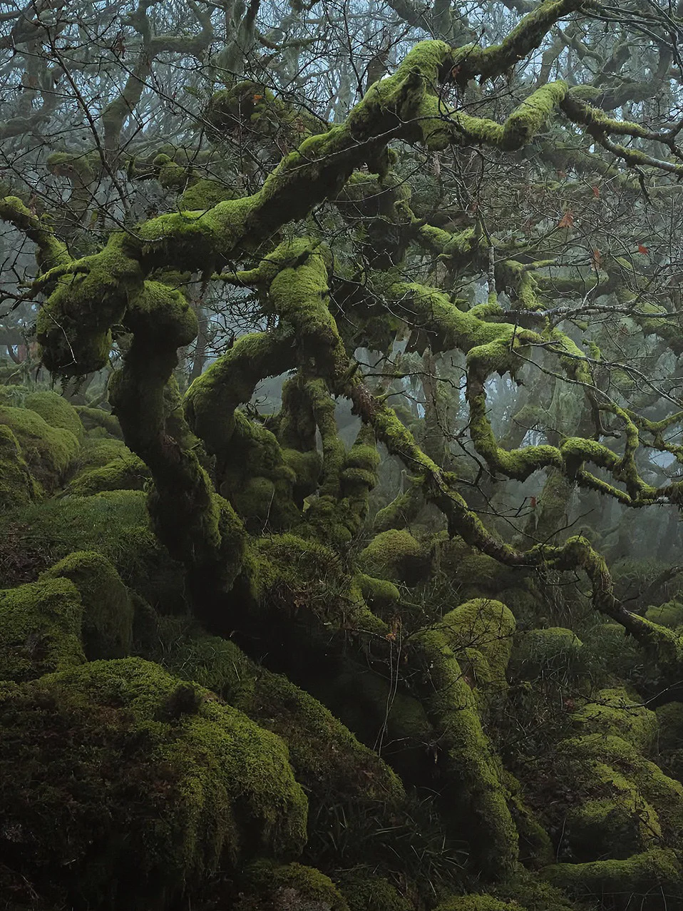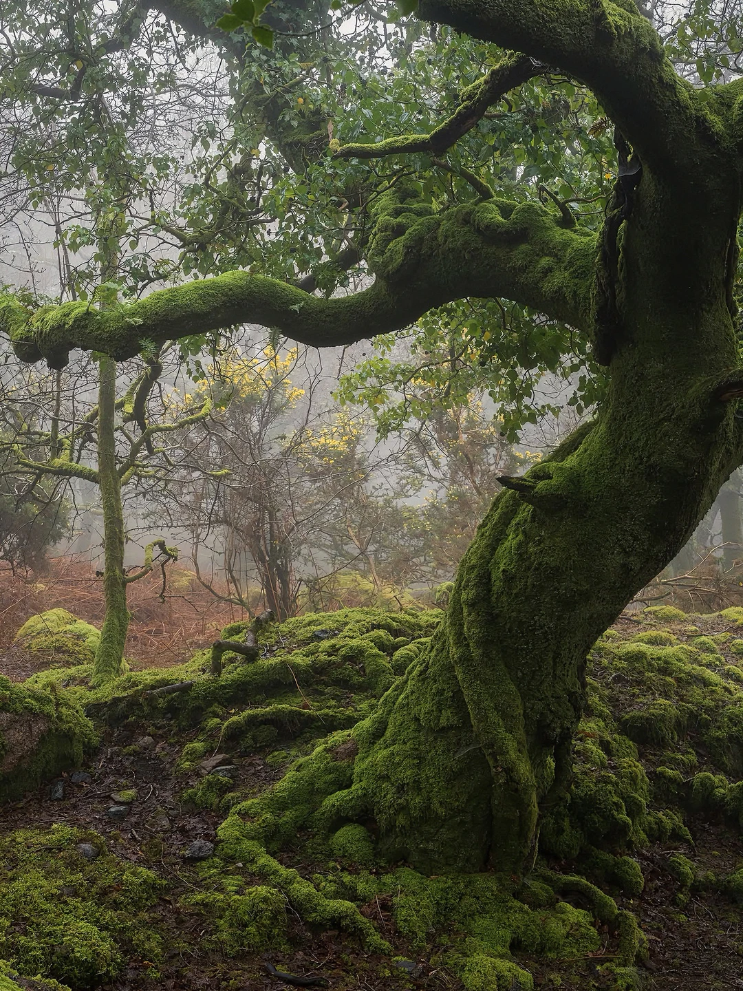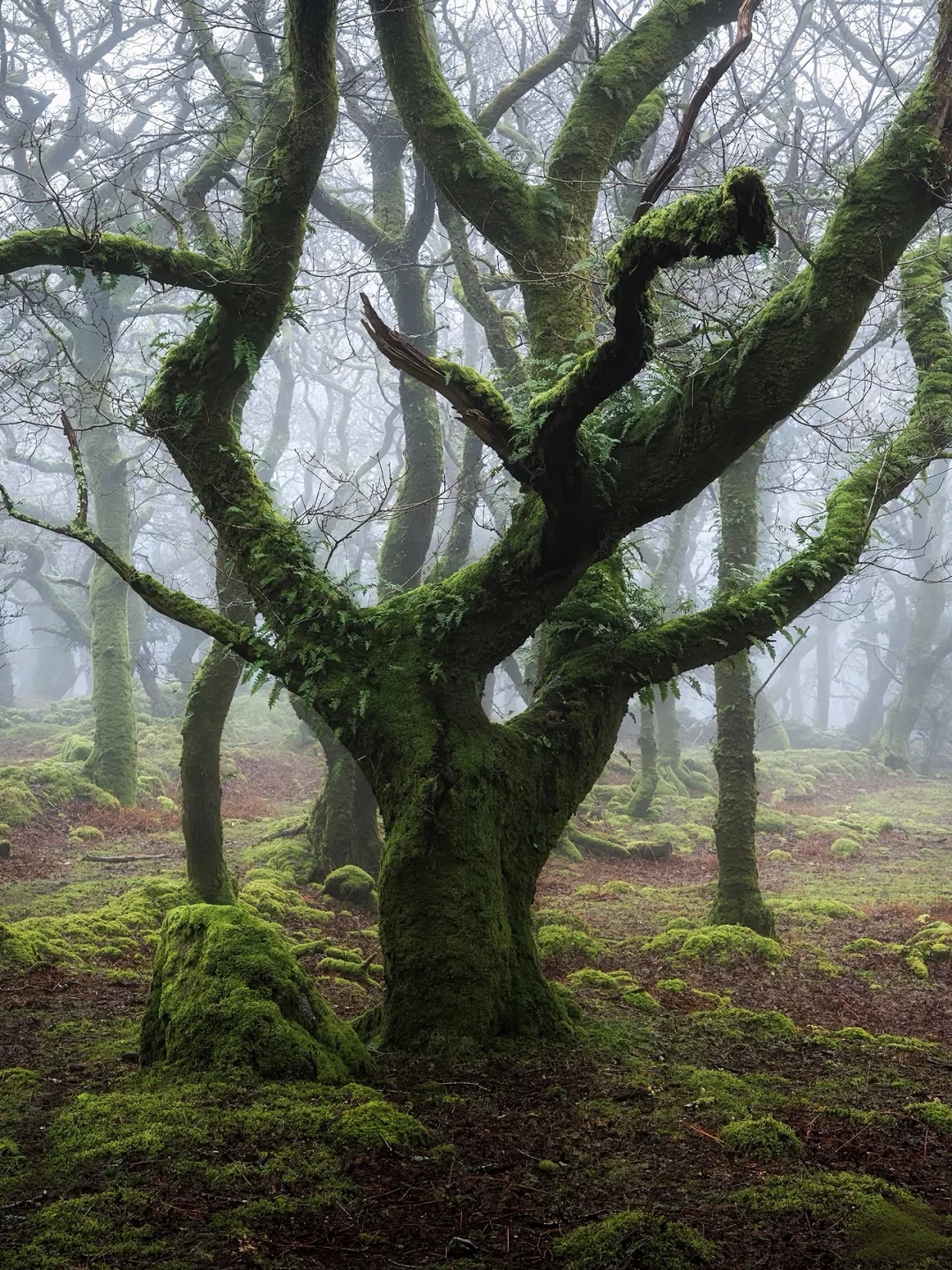 它是英国海拔最高的古老橡树林之一,据说这里的树木是德鲁伊的遗迹,长得歪七扭八,像极了《哈利波特》里的打人柳,满身挂满了灰色的苔藓,像老人的胡须一样垂下来。
