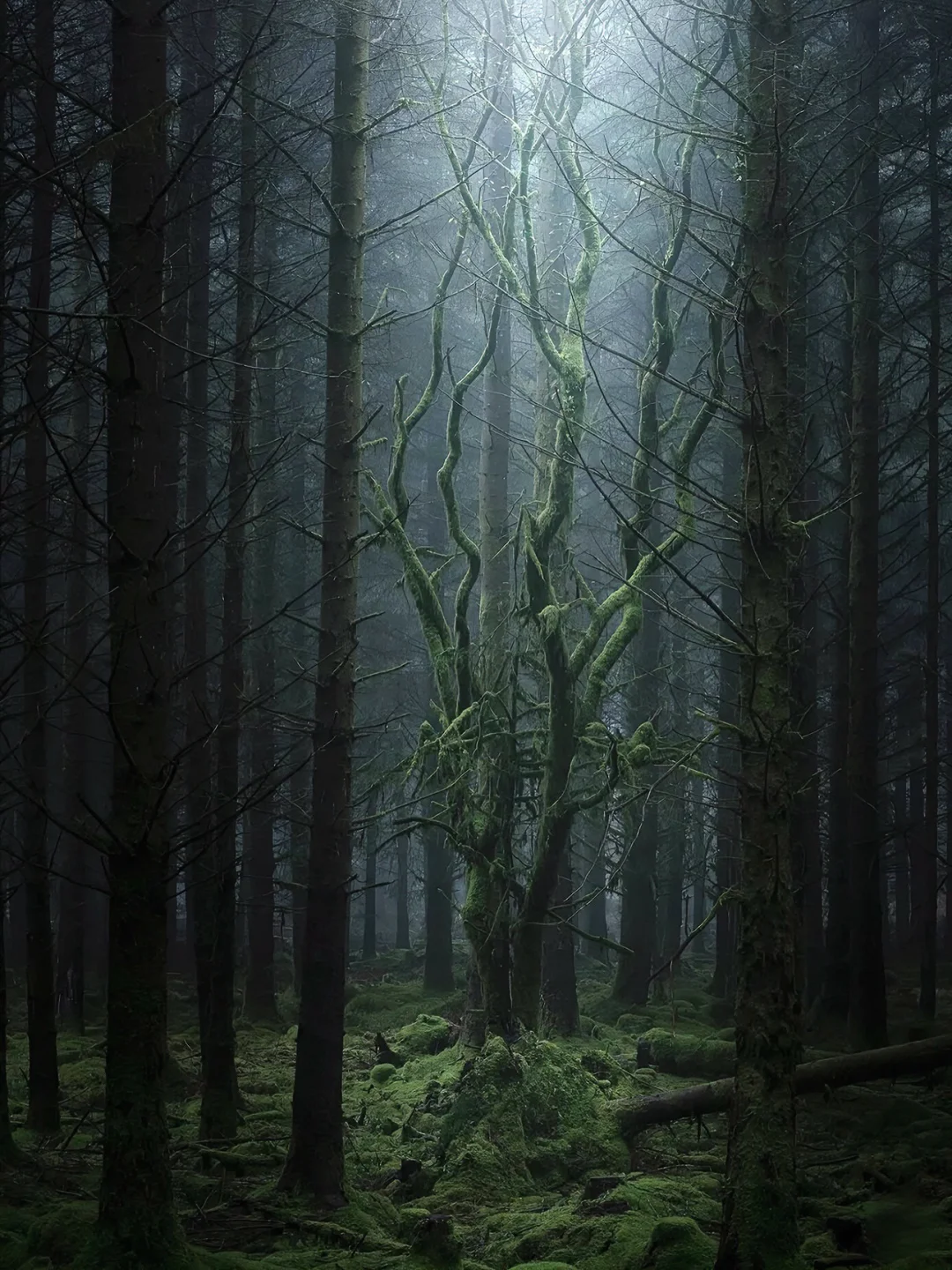 森林里的巨石上覆满厚厚的绿苔,空气中是潮湿的木头和泥土气息。因为树冠太密,阳光很难透进来,哪怕是正午,里面也是幽暗的墨绿色。