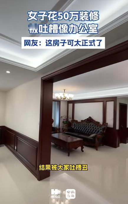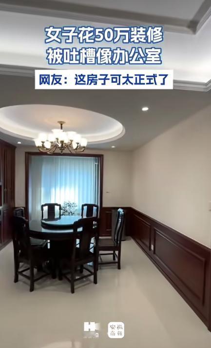 (信息来源:徽视点《女子花50万装修被吐槽像办公室。网友:第一次用“严肃”来形容装修风格!》)
