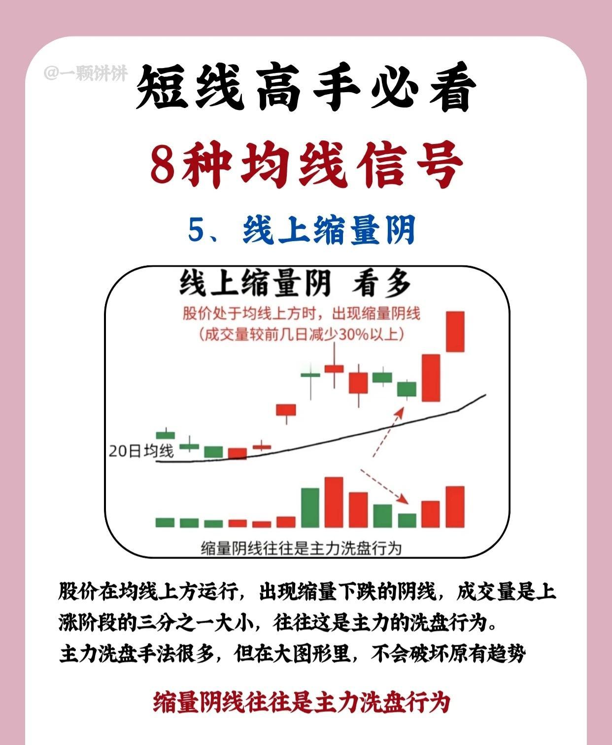 股价在均线上方运行,出现缩量阴线(成交量较前几日减少30%以上)。