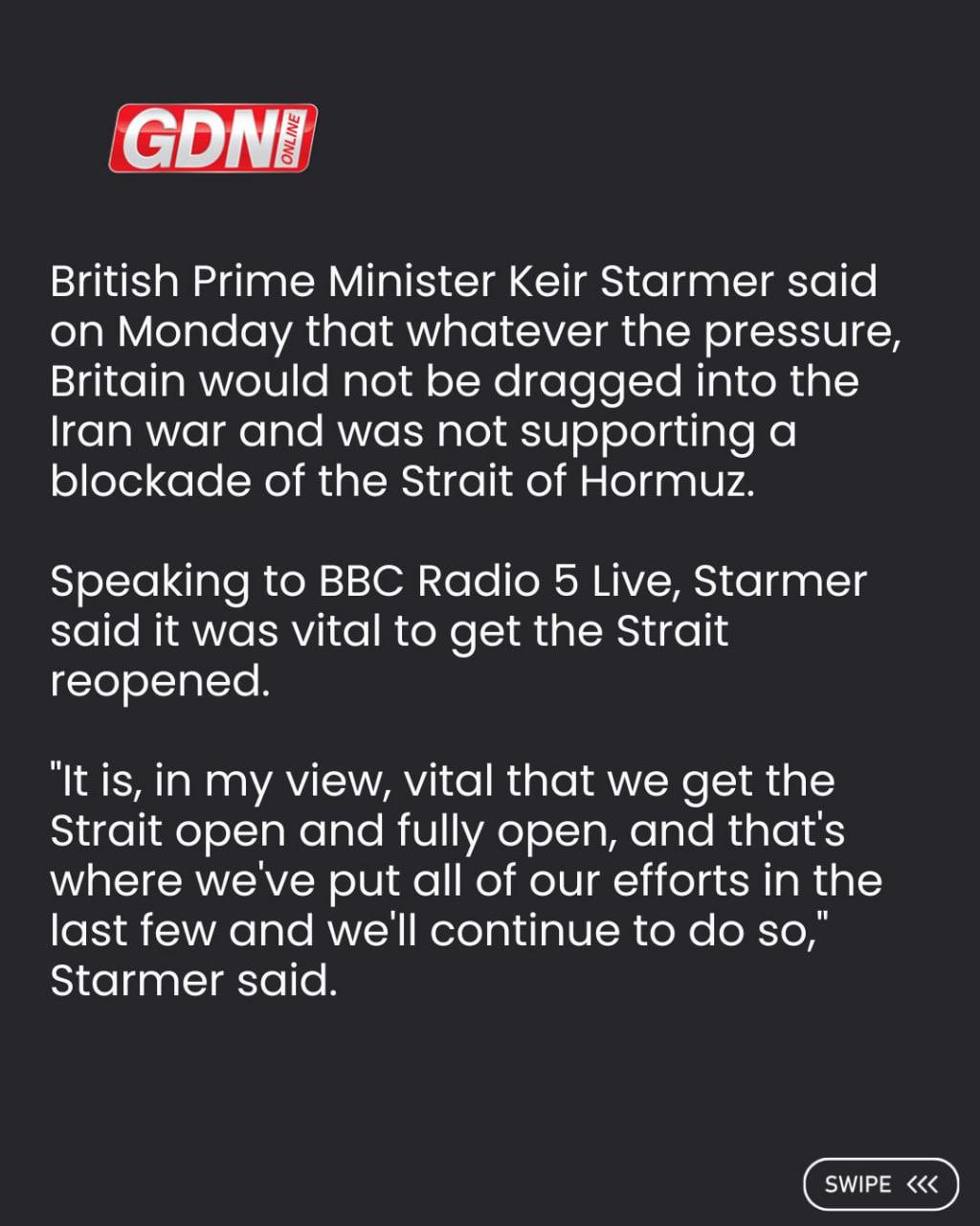 英国首相基尔·斯塔默明确放话,无论外界施加多大压力,英国都不会卷入对伊朗战争,更不会支持封锁霍尔木兹海峡。 他在BBC广播5台采访时强调,全力推动海峡全面开放才是当下的关键,英国近期已将所有精力投入其中,并且会持续坚持这一立场。