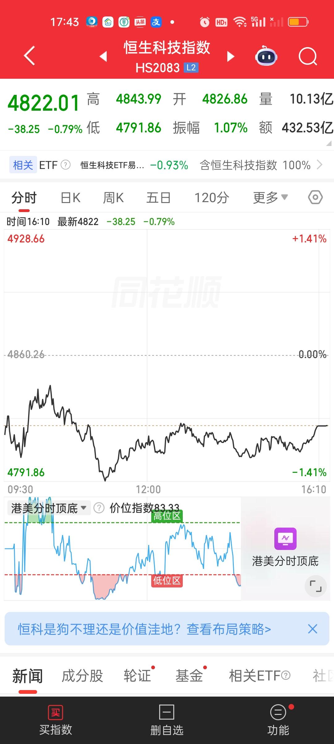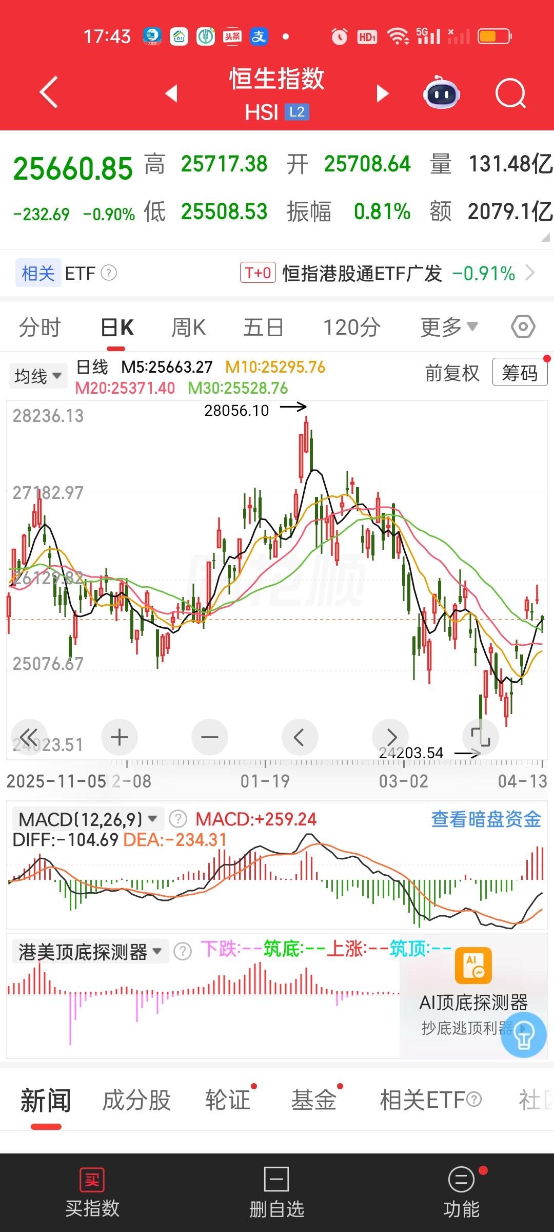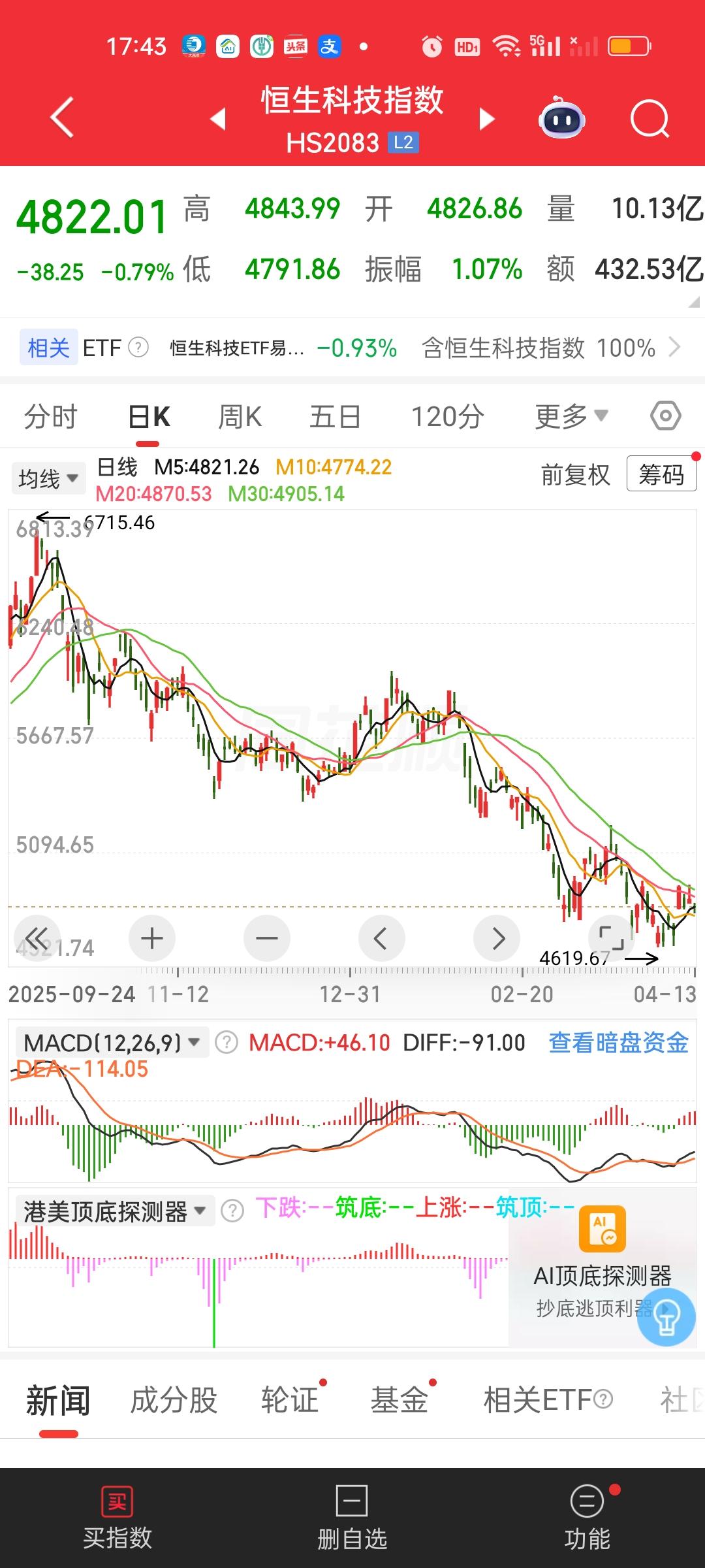 港股收盘了,从盘面走势来看,下午还是小幅拉升了一些。恒指并没有站上5日线,距离5日线只有2个多点,但依旧站在其它所有均线的上方。恒科已经跌破了5日线,目前仅仅只是站在10日线上方。这个地方还得磨啊磨,没有那么快开启行情的。但你说还要向下跌很多,那也没有。就稳稳拿着就好。不是每天都要交易的。